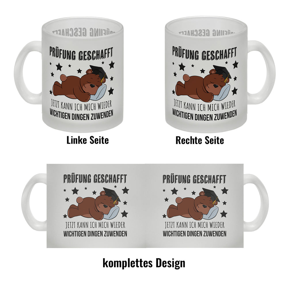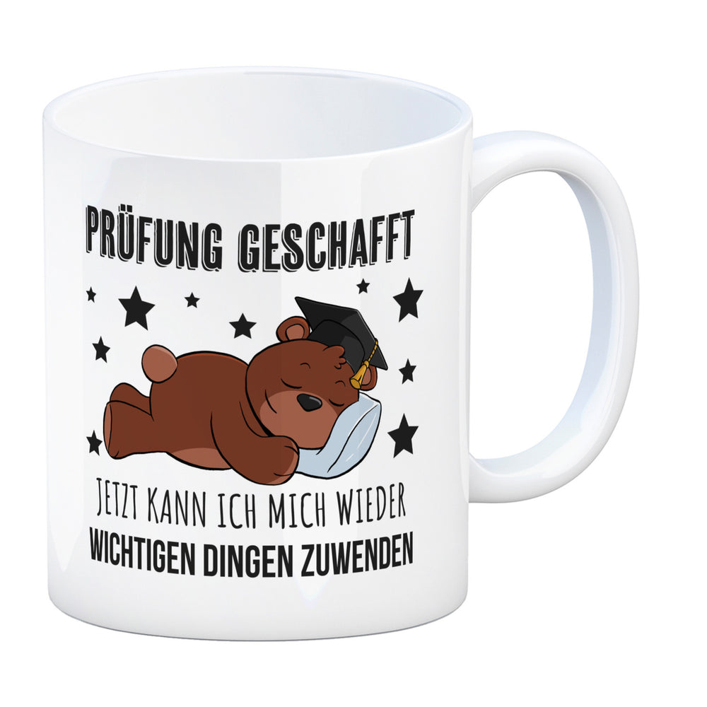 - 1x Schlafender Bär mit Doktorhut Kaffeebecher mit Spruch Prüfung bestanden in der gewählten Ausführung