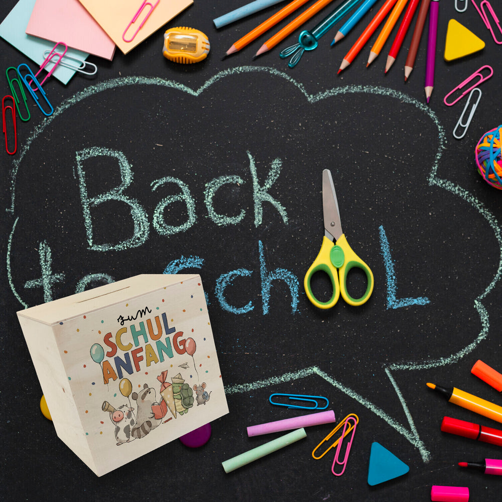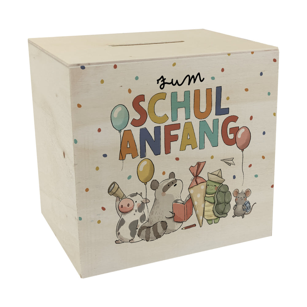 • 1x Tiere zur Einschulung Spardose mit Spruch Zum Schulanfang in der gewählten Ausführung
