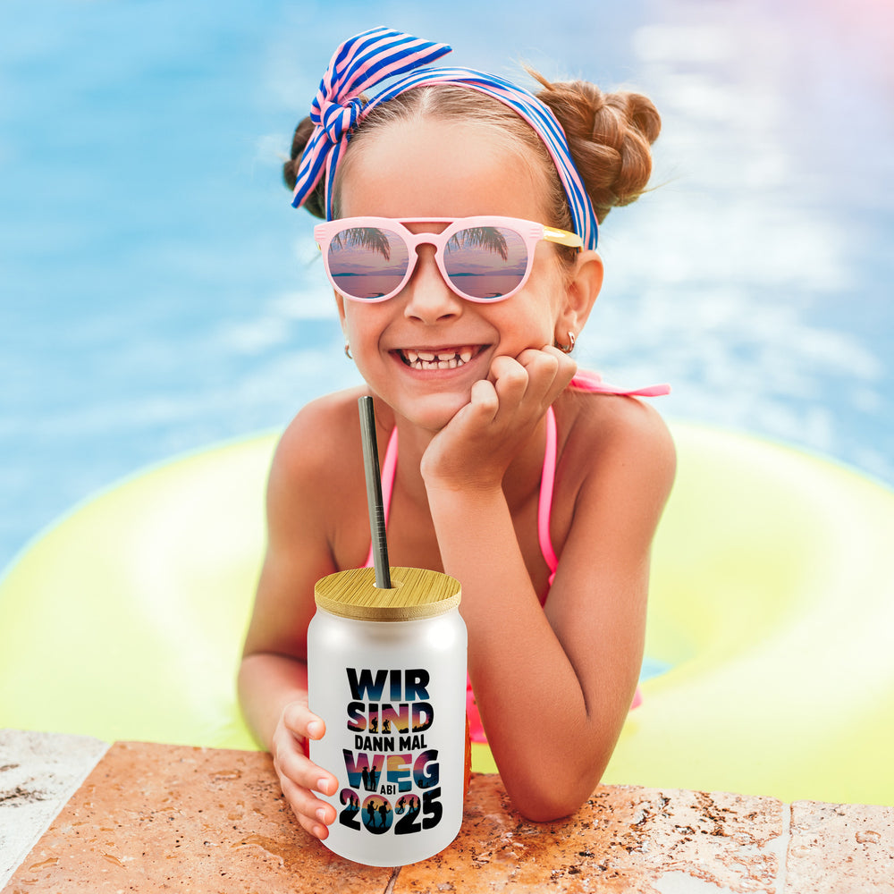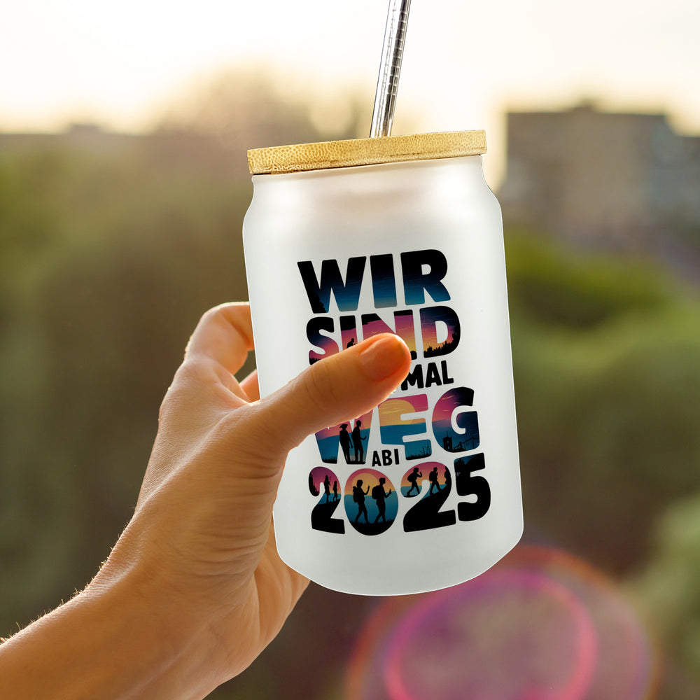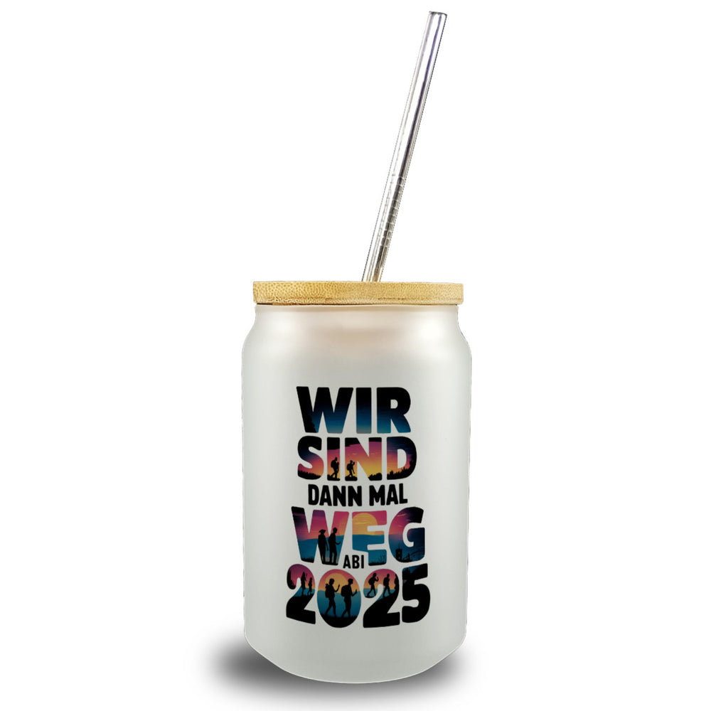 - 1x Wir sind dann mal weg Trinkglas mit Bambusdeckel ABI 2025 mit Bambusdeckel oder Henkel