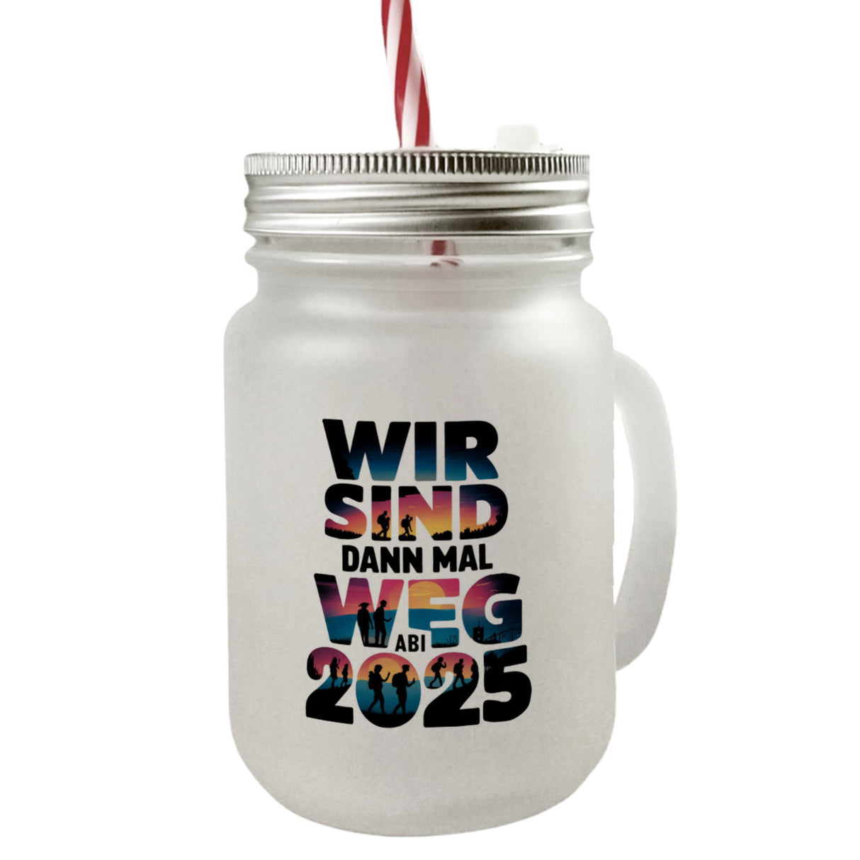 - Das Trinkglas ist ein lebendiges Kunstwerk! Mit den Worten "WIR SIND DANN MAL WEG ABI 2025" in großen Buchstaben, Silhouetten von Abenteurern und einem wunderschönen Farbverlauf, fängt es den Moment eines Sonnenaufgangs oder -untergangs ein. Ein Design, das Einheit und Aufbruch stimmungsvoll vereint.
