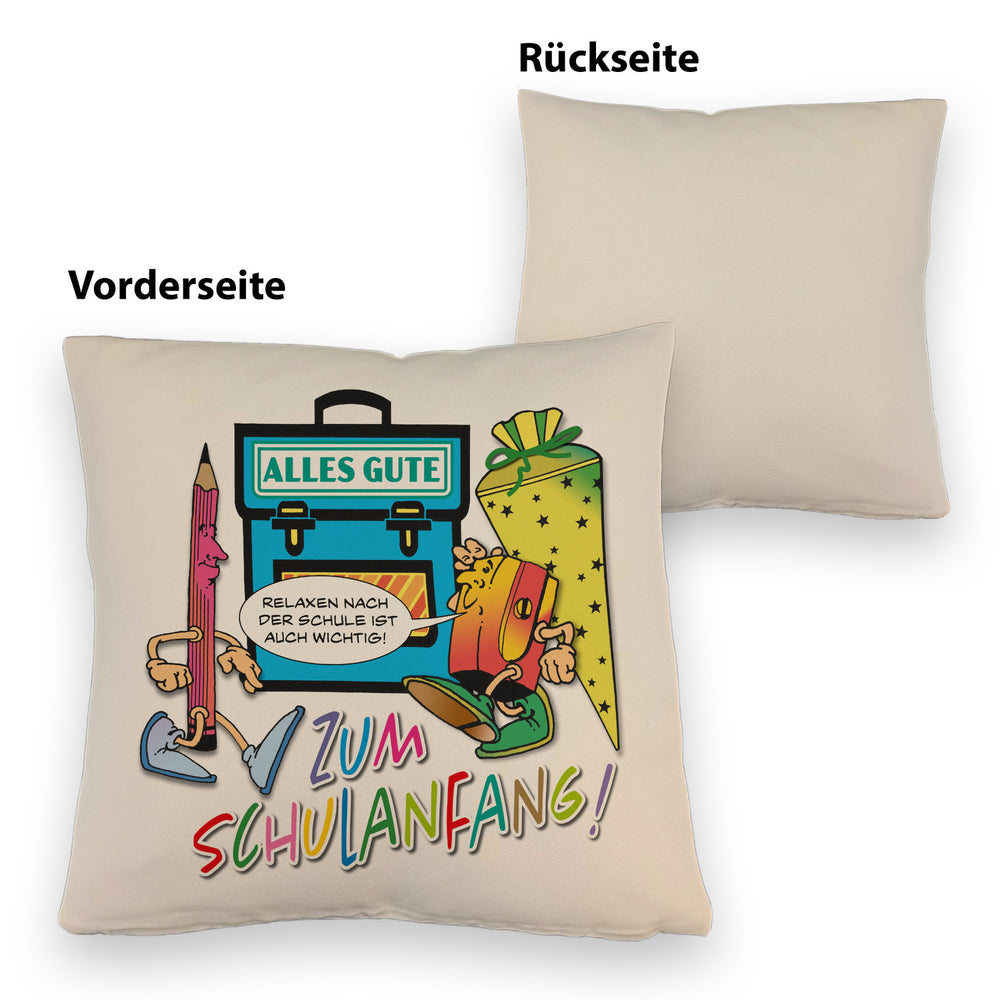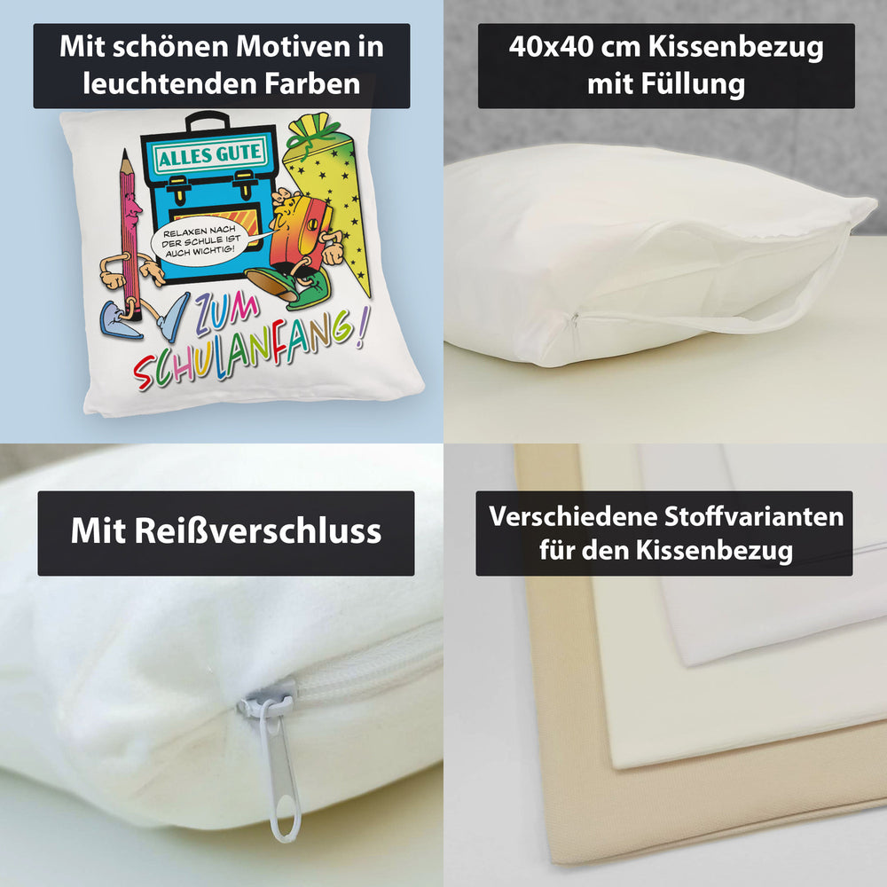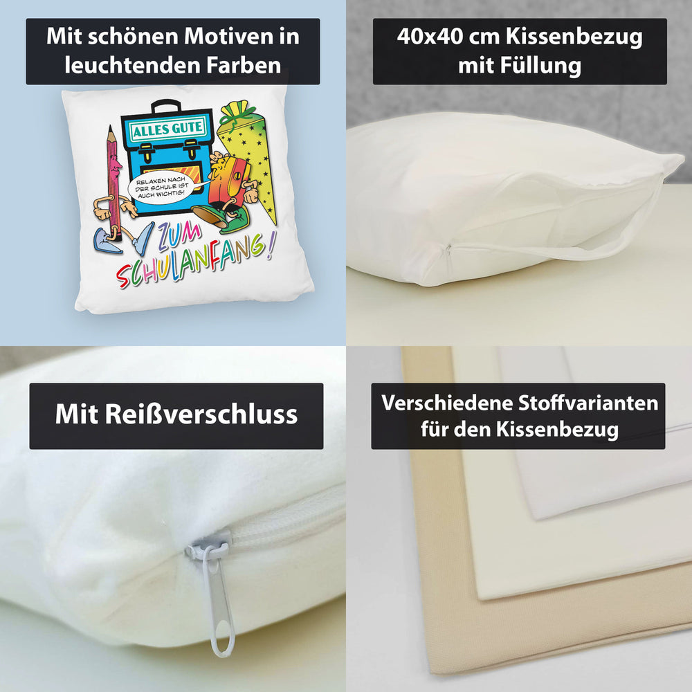 - 1x Alles Gute zum Schulanfang Kissen mit lustigen Schulmotiven in der gewählten Ausführung