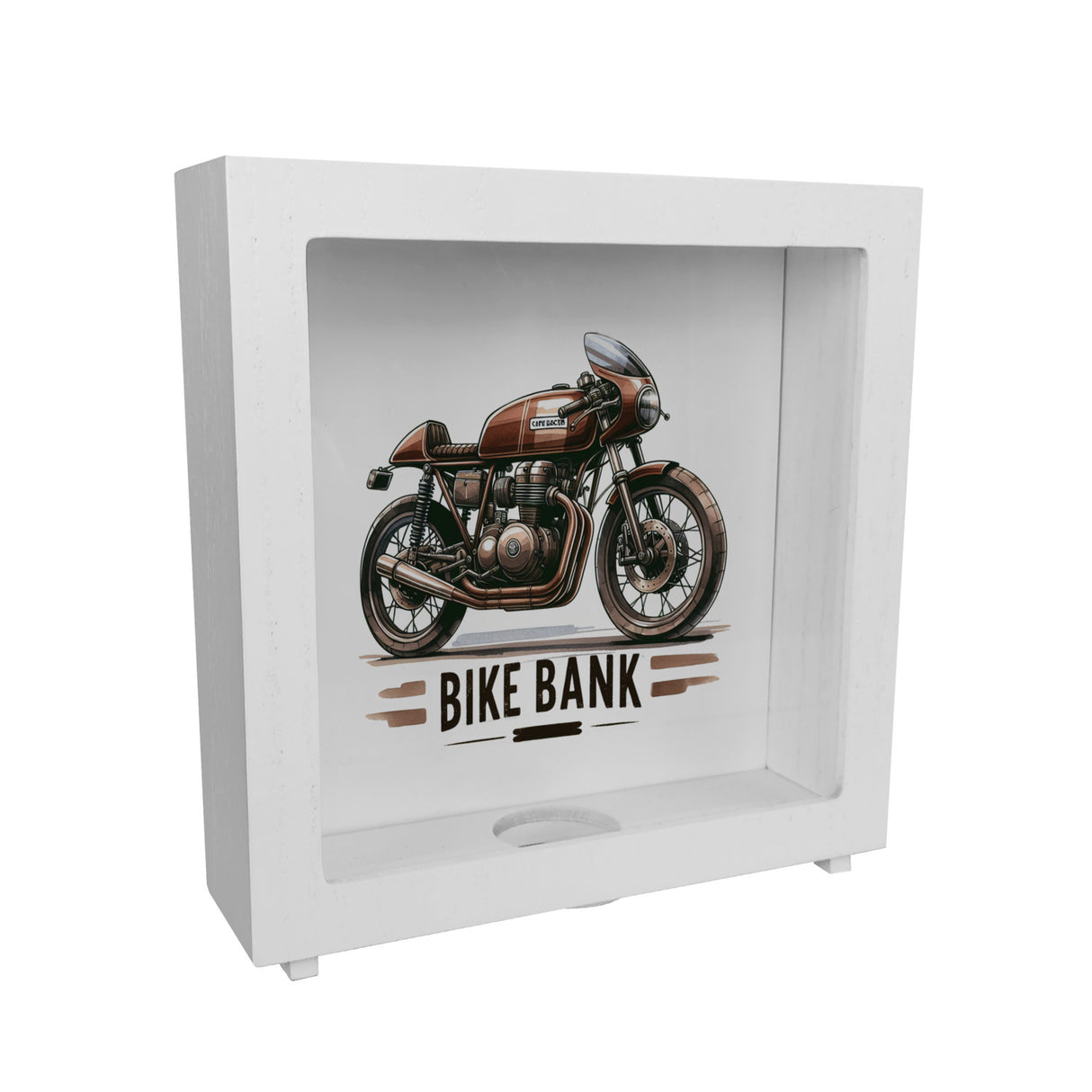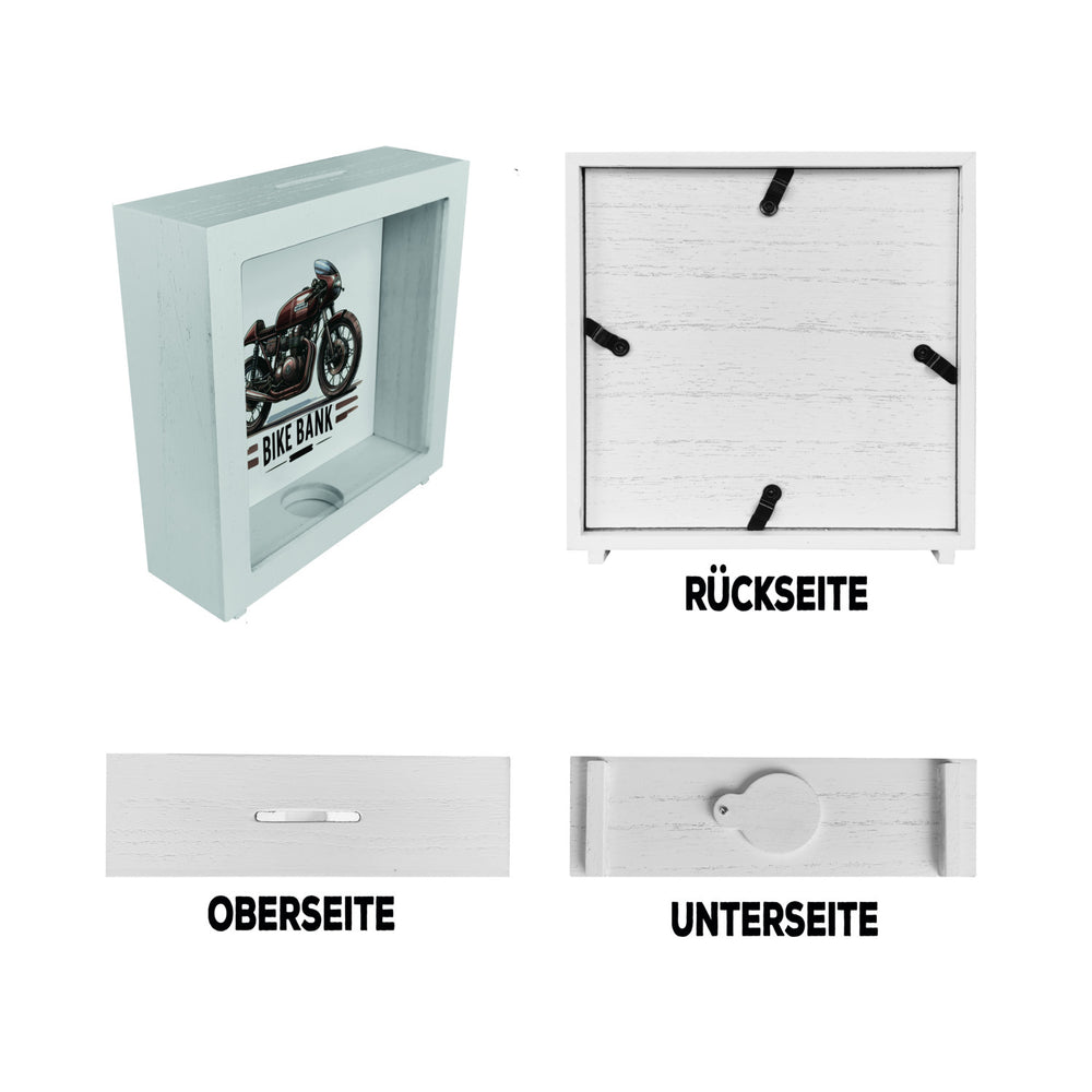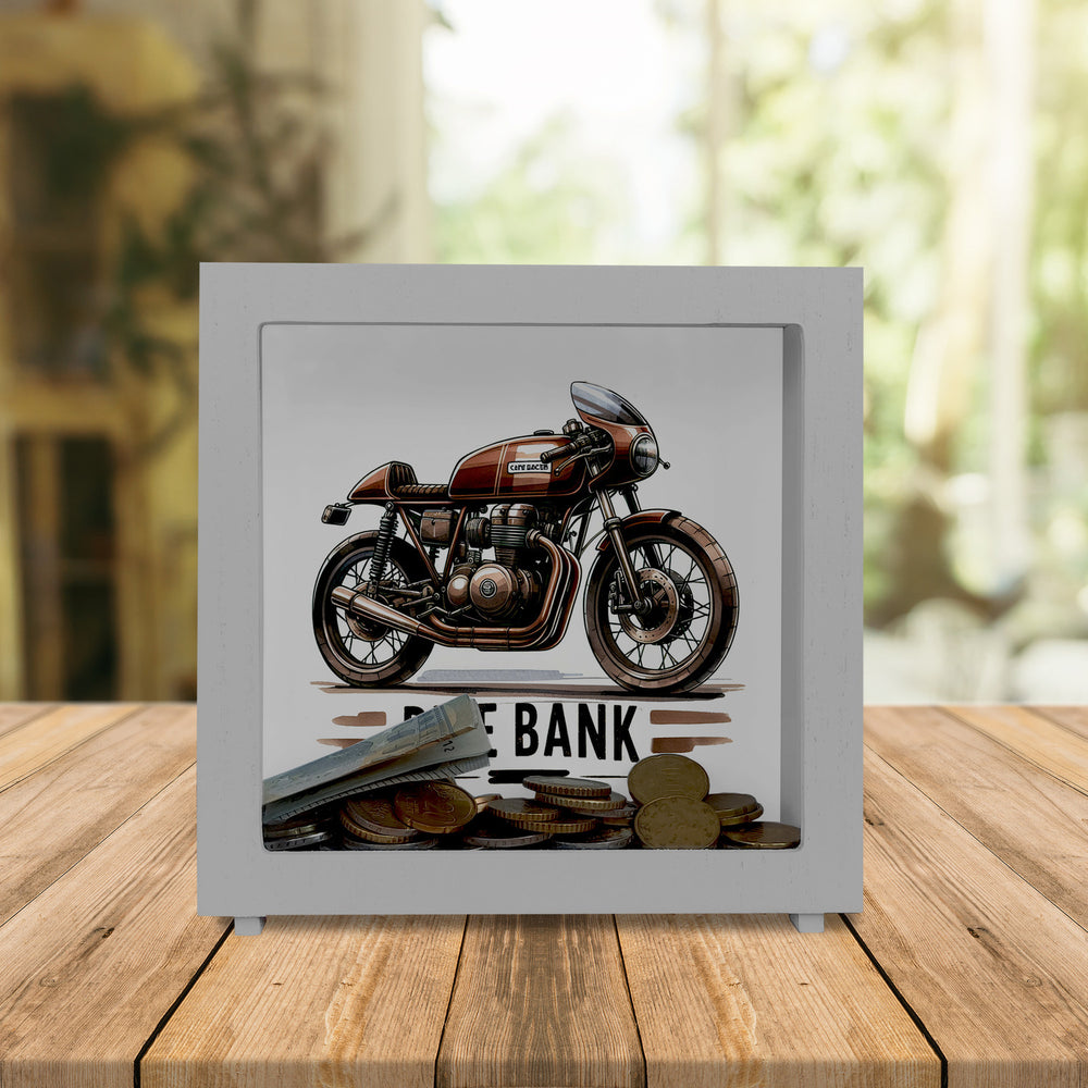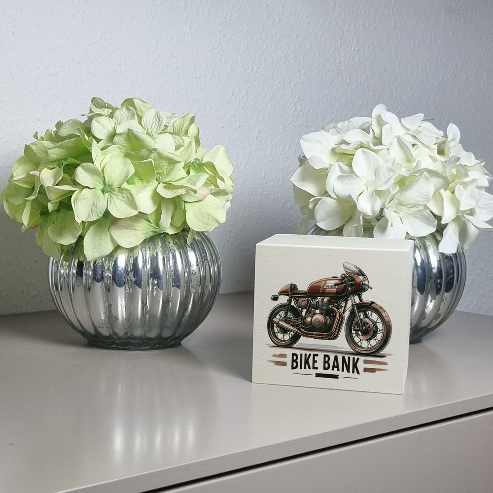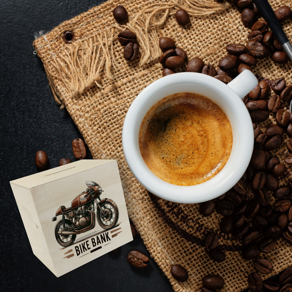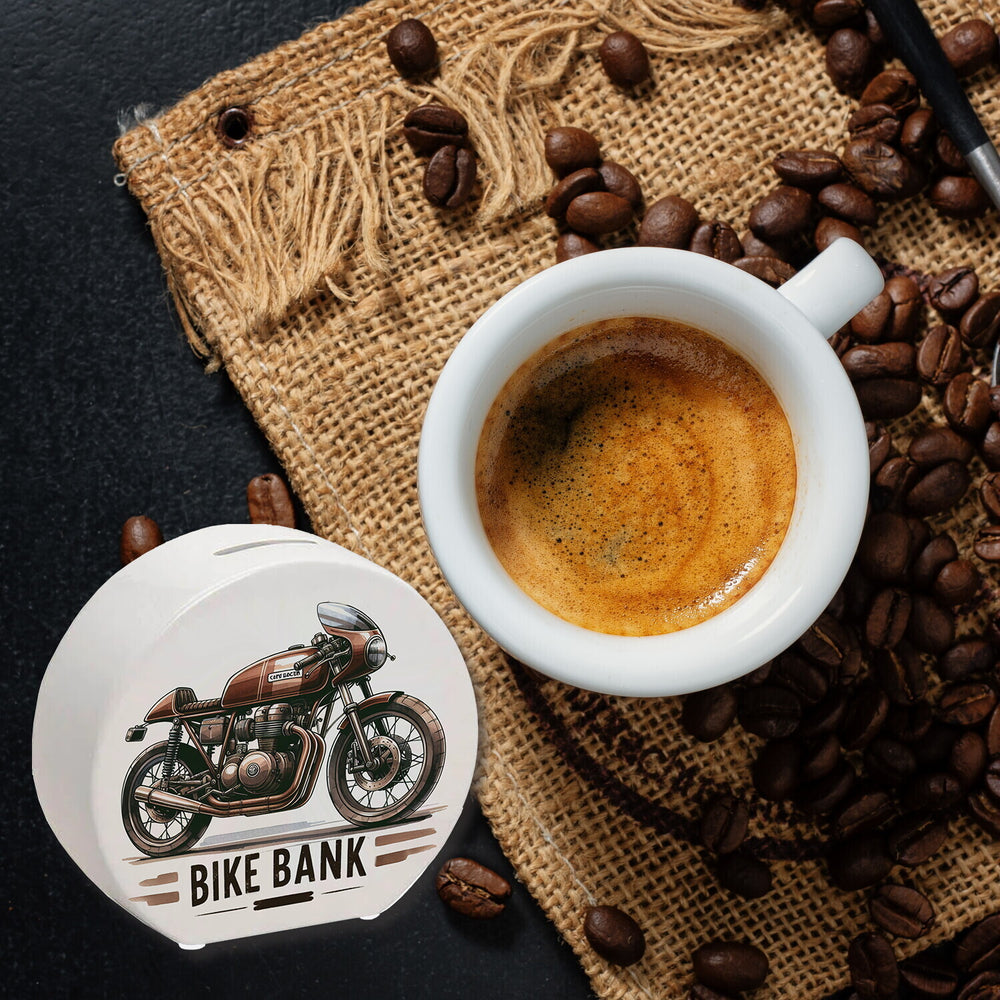 - Perfekt für alle Motorradfans und Kaffeeracer! Die „Bike Bank“ Spardose kombiniert Stil, Spaß und Funktionalität. Füllen, sparen, und vielleicht eines Tages deinen eigenen Cafe Racer kaufen!
