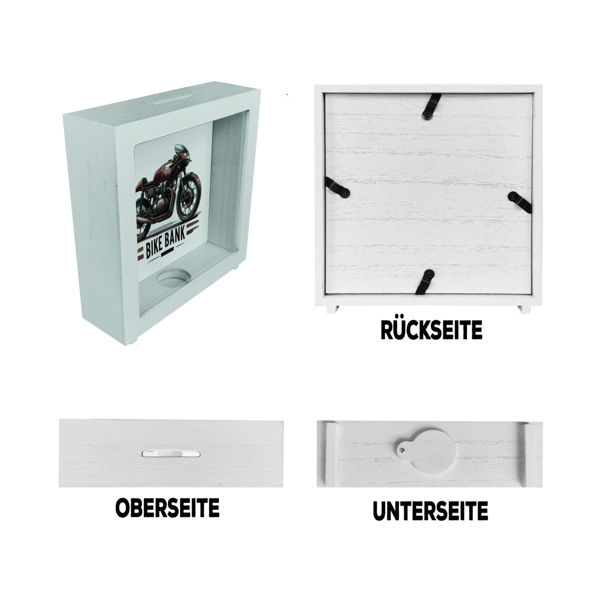 - 1x Cafe Racer Motorrad Spardose mit Spruch Bike Bank in der gewählten Ausführung