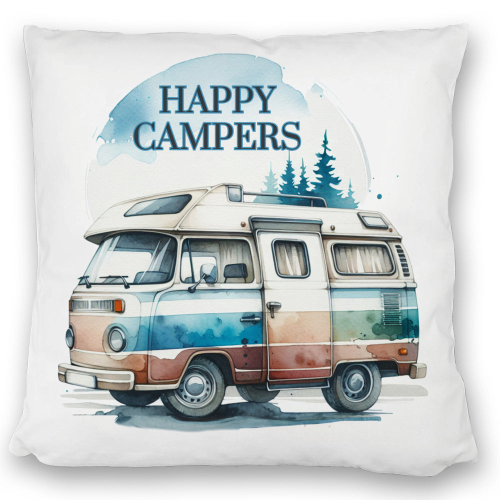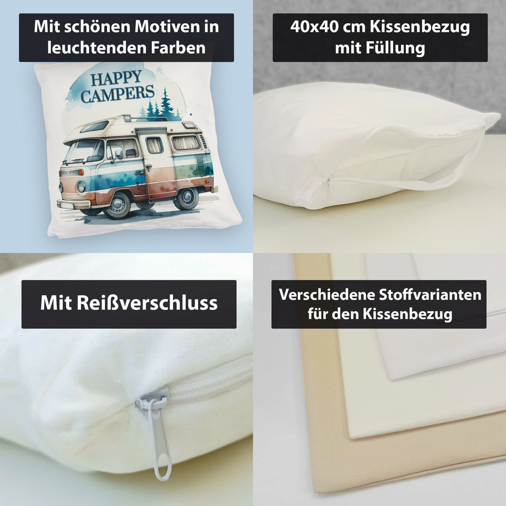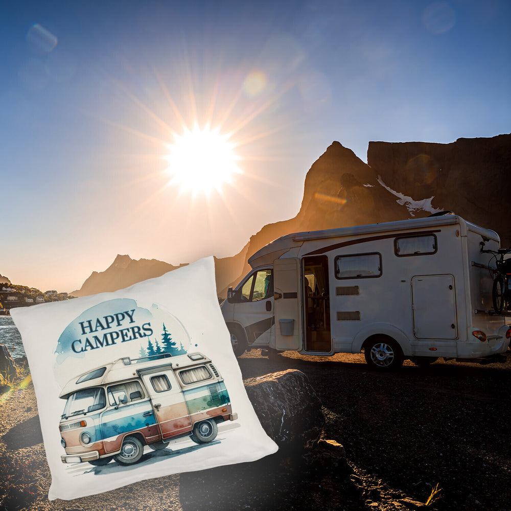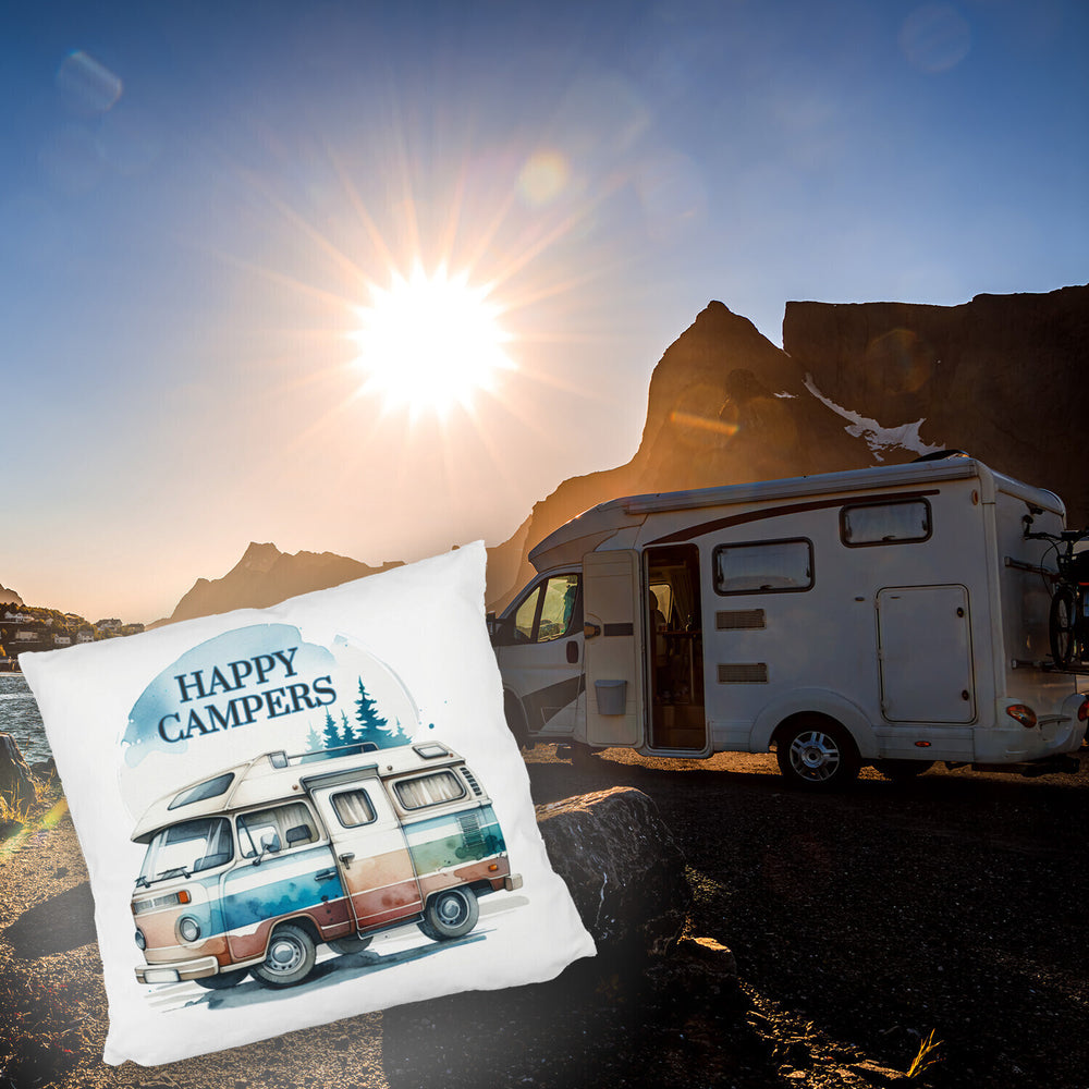 - 1x Campingwagen Kissen mit Spruch Happy Campers in der gewählten Ausführung