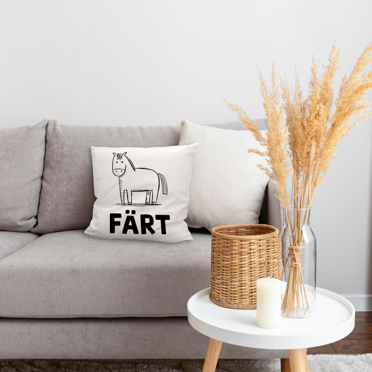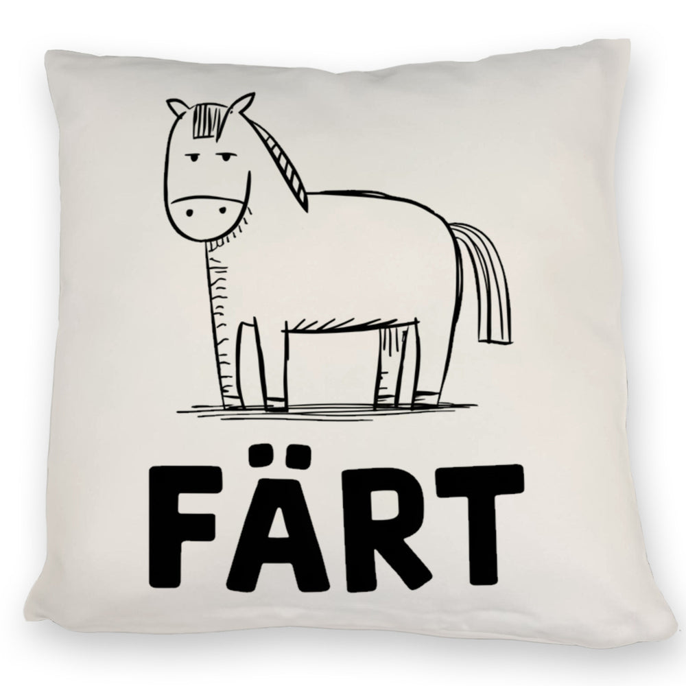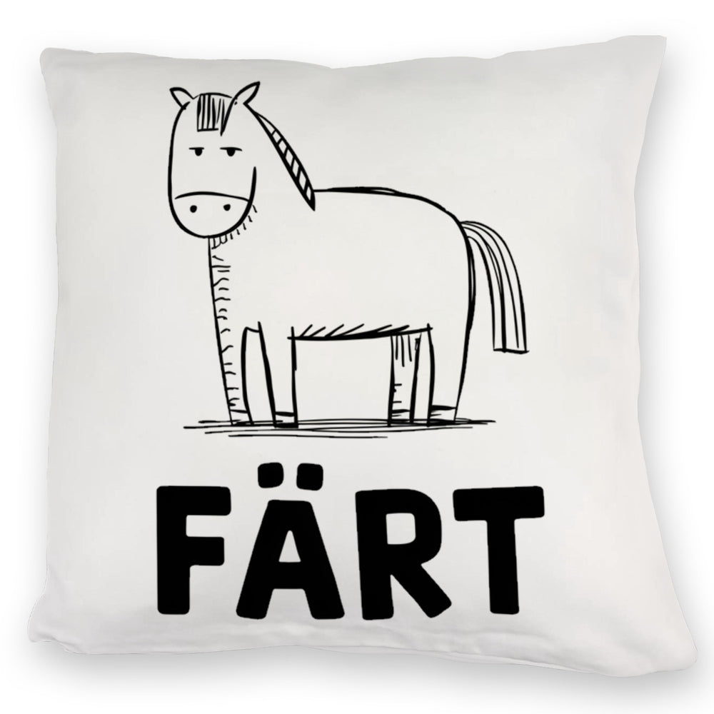 - Das einzigartige Färt Kissen besticht durch seine schlichte Eleganz und ein humorvolles Design. Es zeigt eine handgezeichnete Skizze eines Pferdes mit einem neutralen Gesichtsausdruck. Darunter findet sich das Wortspiel "FÄRT" in fetten, schwarzen Buchstaben auf einem weißen Hintergrund. Die monochrome Farbgebung verleiht dem Kissen einen minimalistischen Charme.