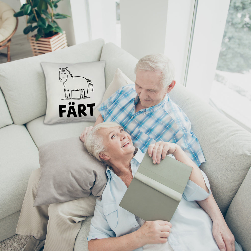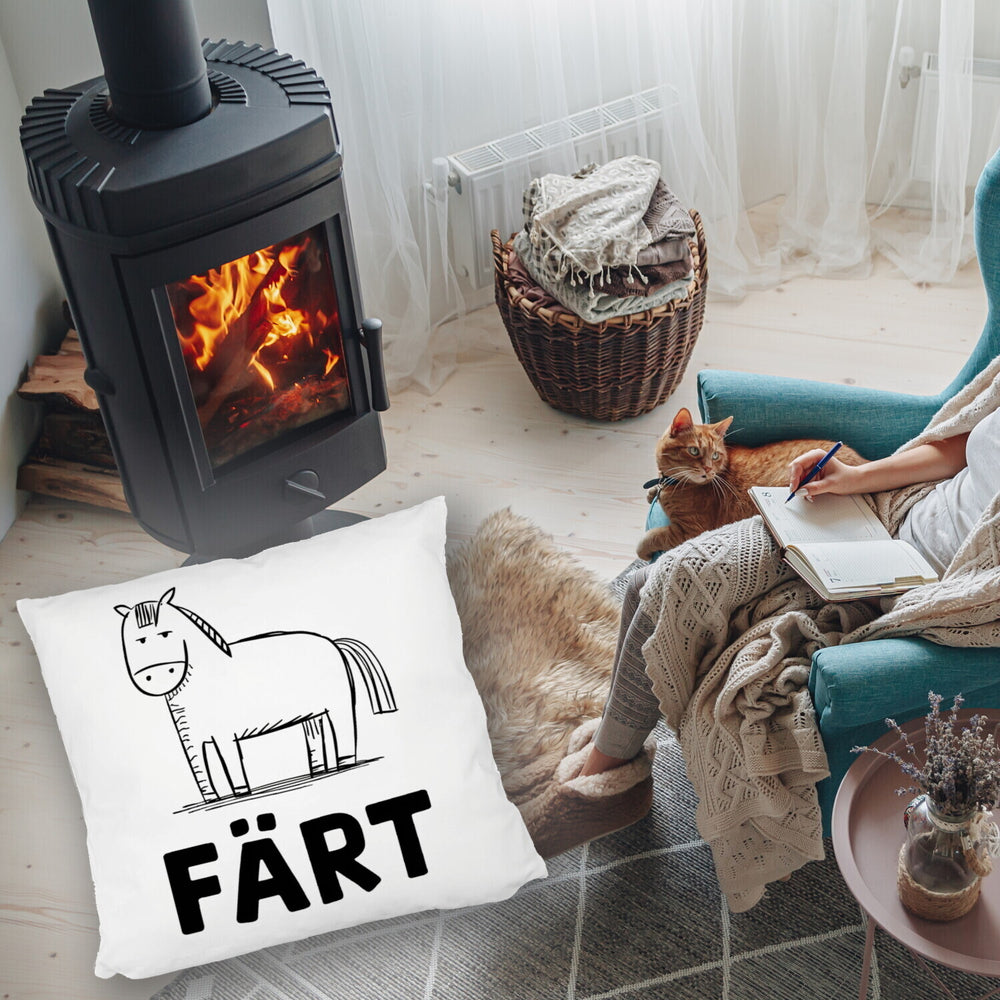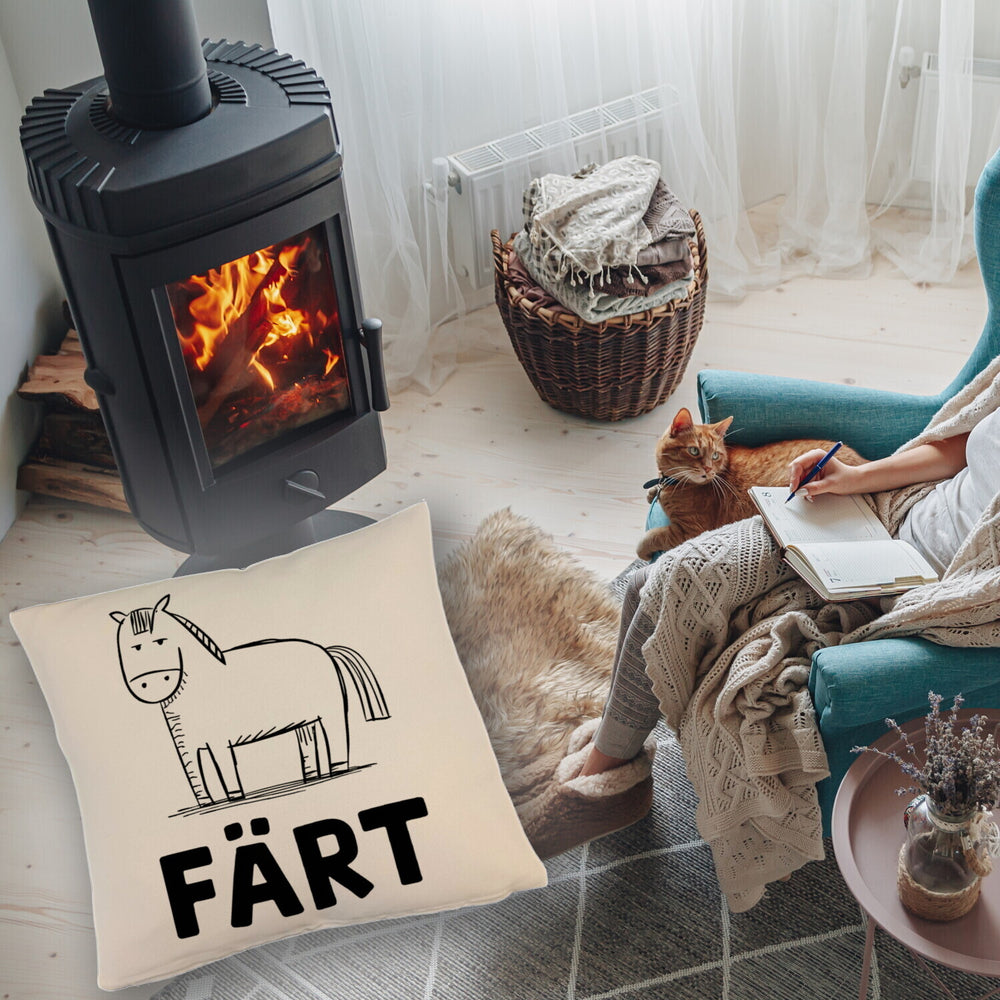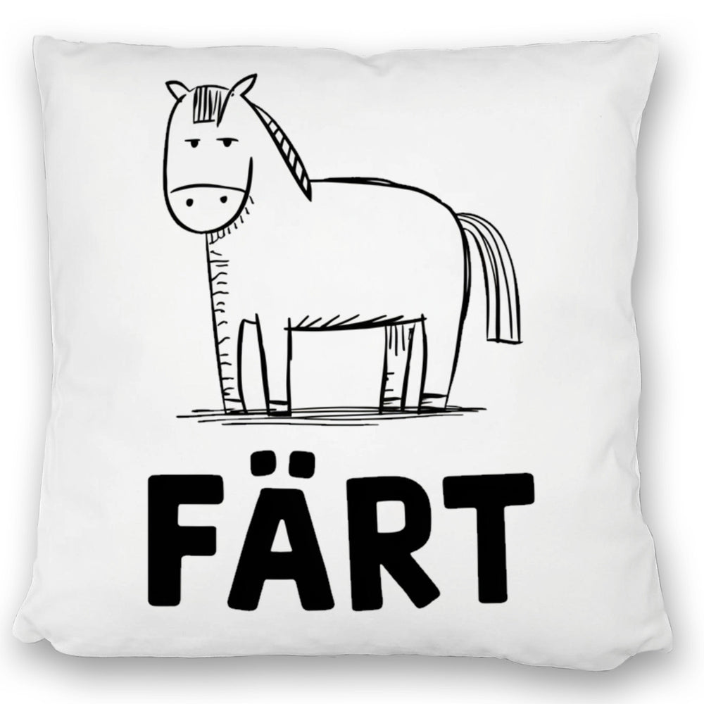 - Das einzigartige Färt Kissen besticht durch seine schlichte Eleganz und ein humorvolles Design. Es zeigt eine handgezeichnete Skizze eines Pferdes mit einem neutralen Gesichtsausdruck. Darunter findet sich das Wortspiel "FÄRT" in fetten, schwarzen Buchstaben auf einem weißen Hintergrund. Die monochrome Farbgebung verleiht dem Kissen einen minimalistischen Charme.