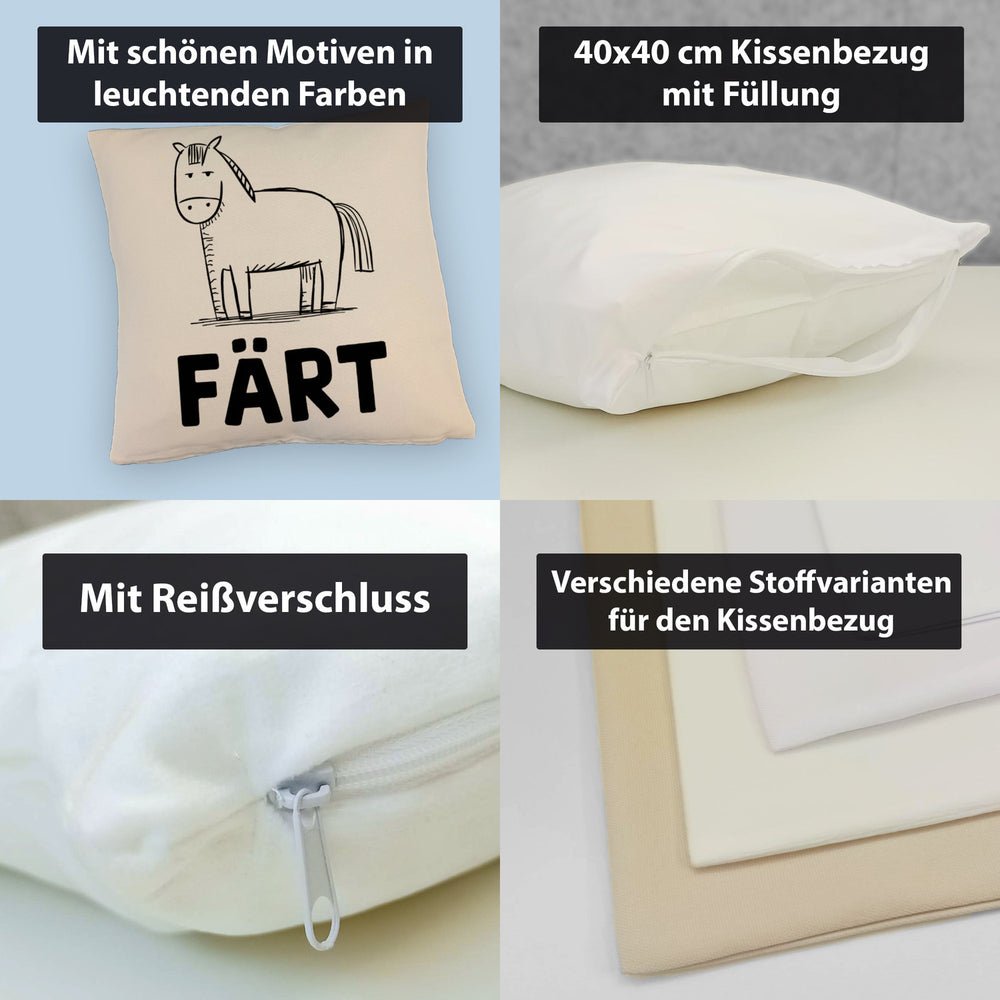 - Greifen Sie zu und holen Sie sich dieses Färt Kissen, das mit viel Liebe zum Detail designt und bedruckt wurde. Machen Sie Ihre Wohnräume mit diesem qualitativ hochwertigen und originellen Stück zu etwas Besonderem und zaubern Sie Ihren Gästen ein Lächeln ins Gesicht!