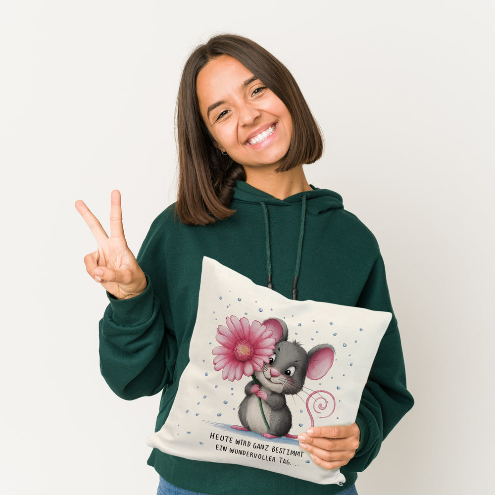 - Entdecken Sie das fröhliche Gute-Laune-Kissen mit einer niedlichen Maus und einer pinken Blume! Diese lächelnde Maus hält die Blume liebevoll an ihr Gesicht. Ihr Schwanz formt ein Herz, und der Hintergrund mit blauen Punkten könnte Schneeflocken darstellen. Unten steht motivierend: "Heute wird ganz bestimmt ein wundervoller Tag...".
