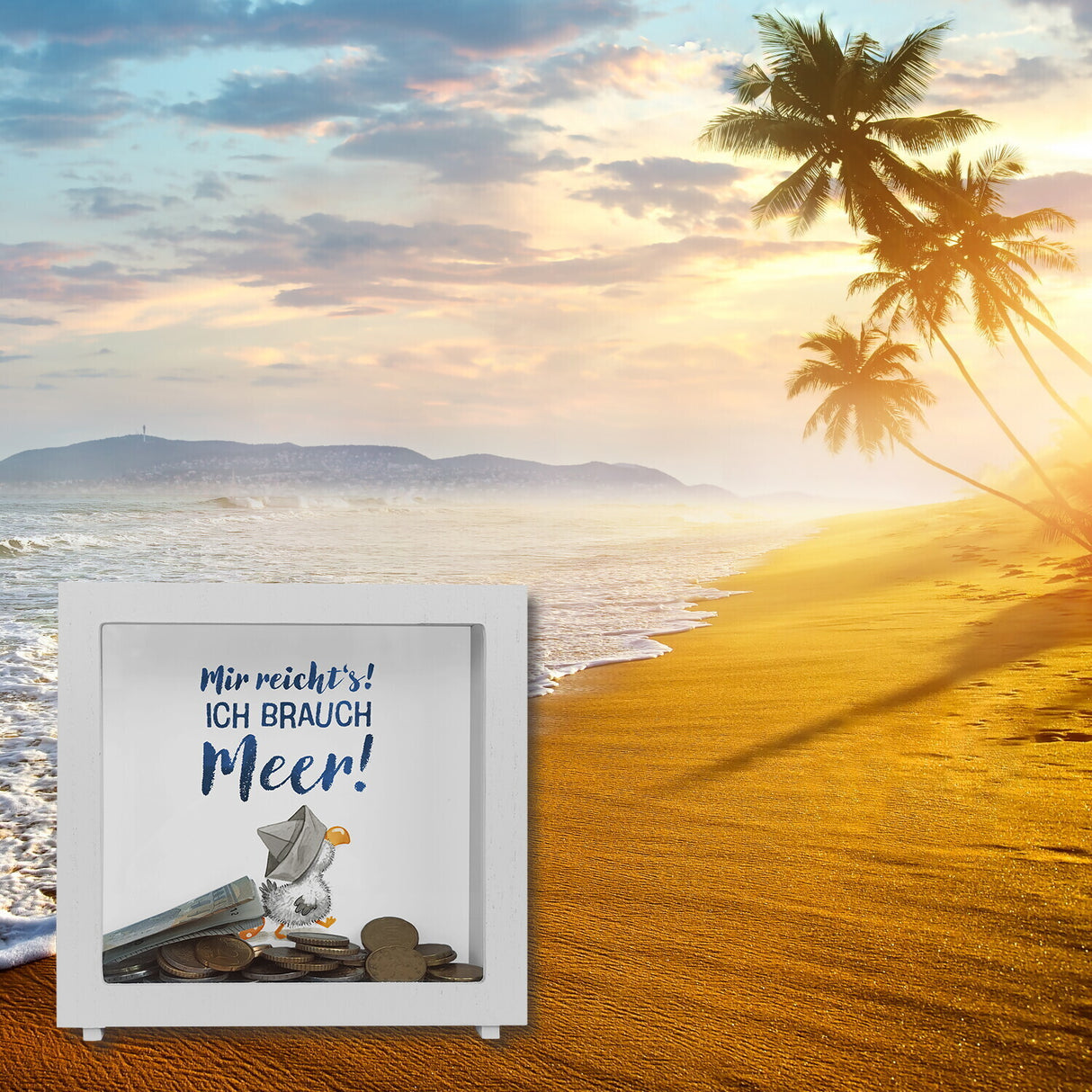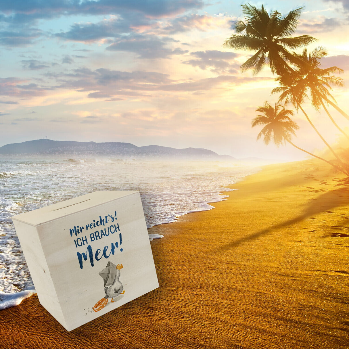 - 1x Möwe mit Schwimmreifen Spardose mit Spruch Mir reicht‘s ich brauch Meer in der gewählten Ausführung