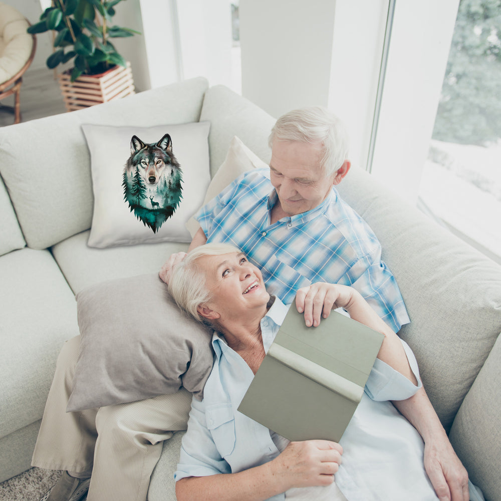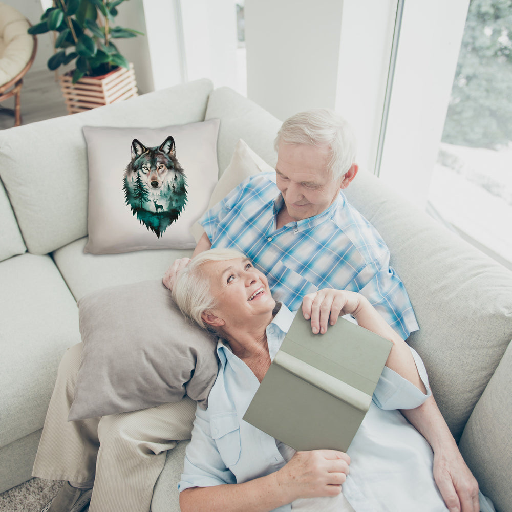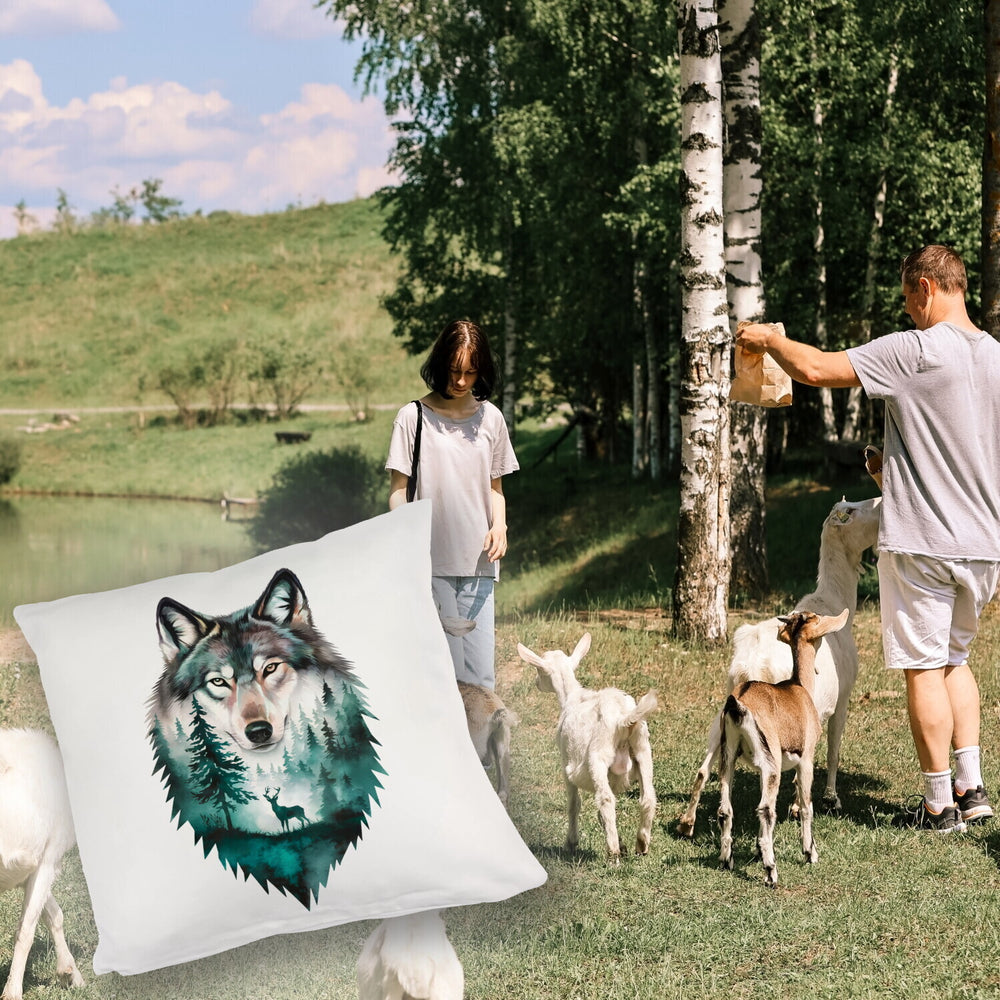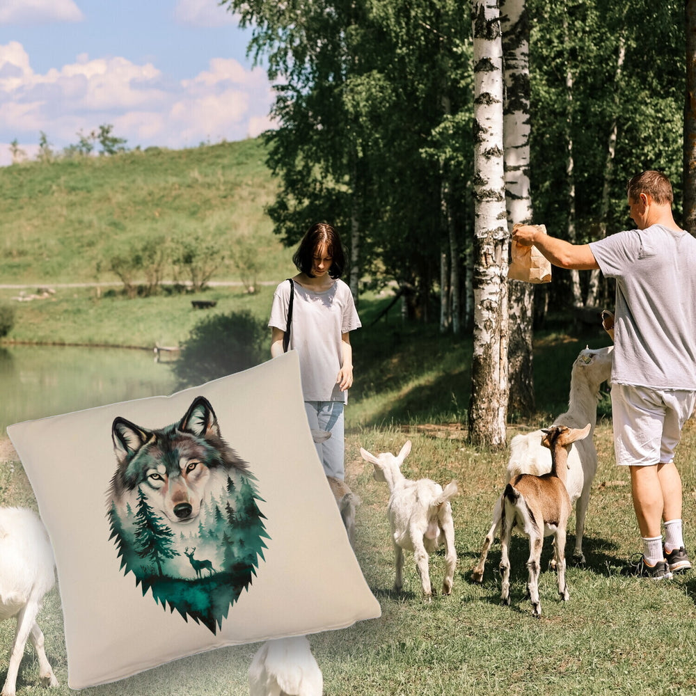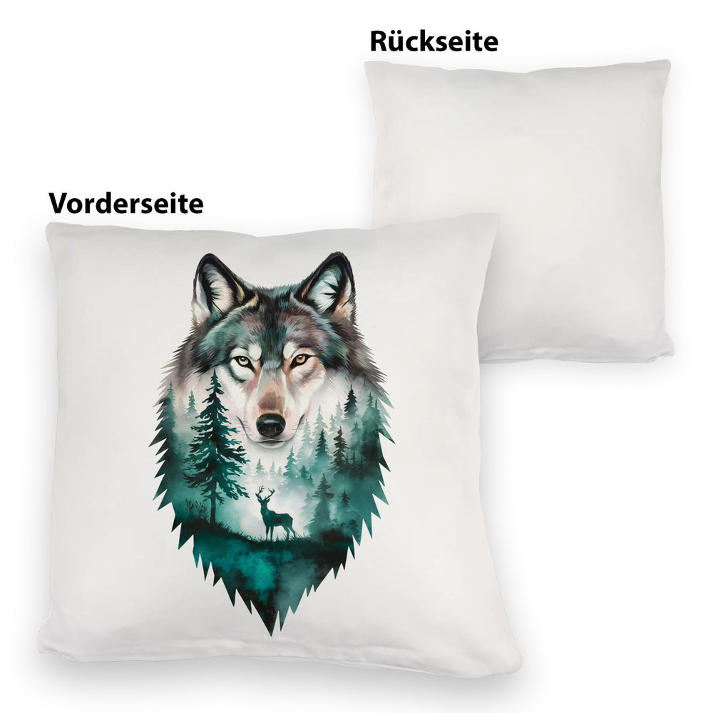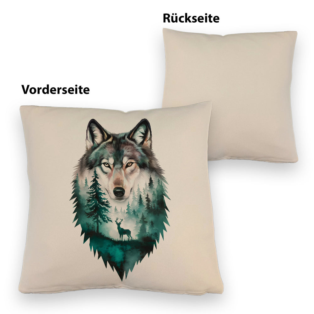 - Das Naturfreunde Kissen zeigt ein faszinierendes Wolf Aquarell Landschaft Motiv. Ein Wolf mit einer nebligen Waldlandschaft in seinem Zentrum, hohe Kiefern und die Silhouette eines Hirsches, dominieren in kühlen Grün- und Türkistönen. Der Kontrast zwischen scharfen Wolfslinien und weichem Hintergrund erzeugt ein eindrucksvolles Kunstwerk.