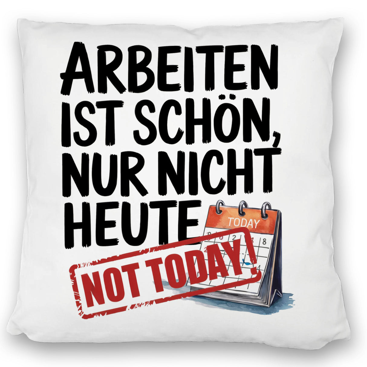 - Das lustige Dekokissen mit dem Spruch "Arbeiten ist schön, nur nicht heute" bringt sofort ein Schmunzeln ins Gesicht. Auf weißem Hintergrund prangt der humorvolle Text in pastelligen Aquarellfarben. Ein roter "NOT TODAY!"-Stempel und ein Kalender, der den heutigen Tag heraushebt, runden das witzige Design ab.