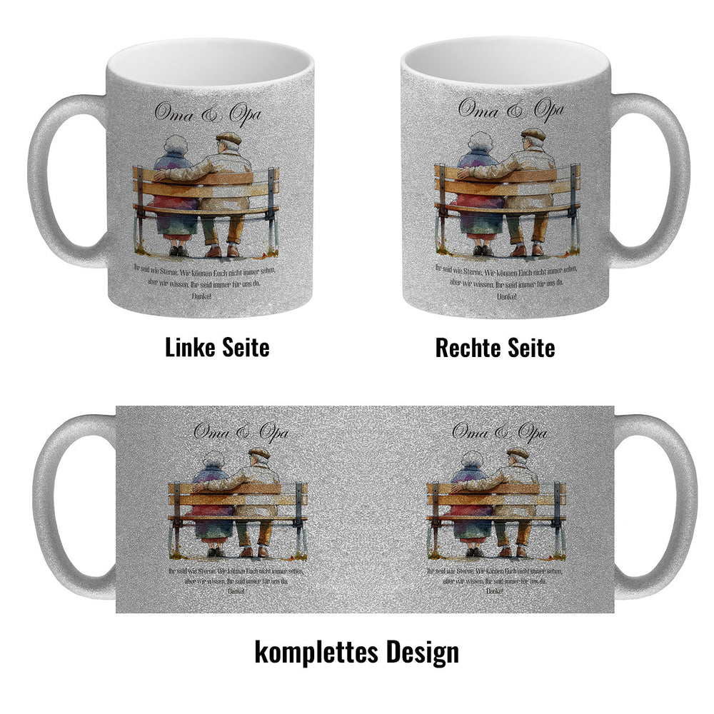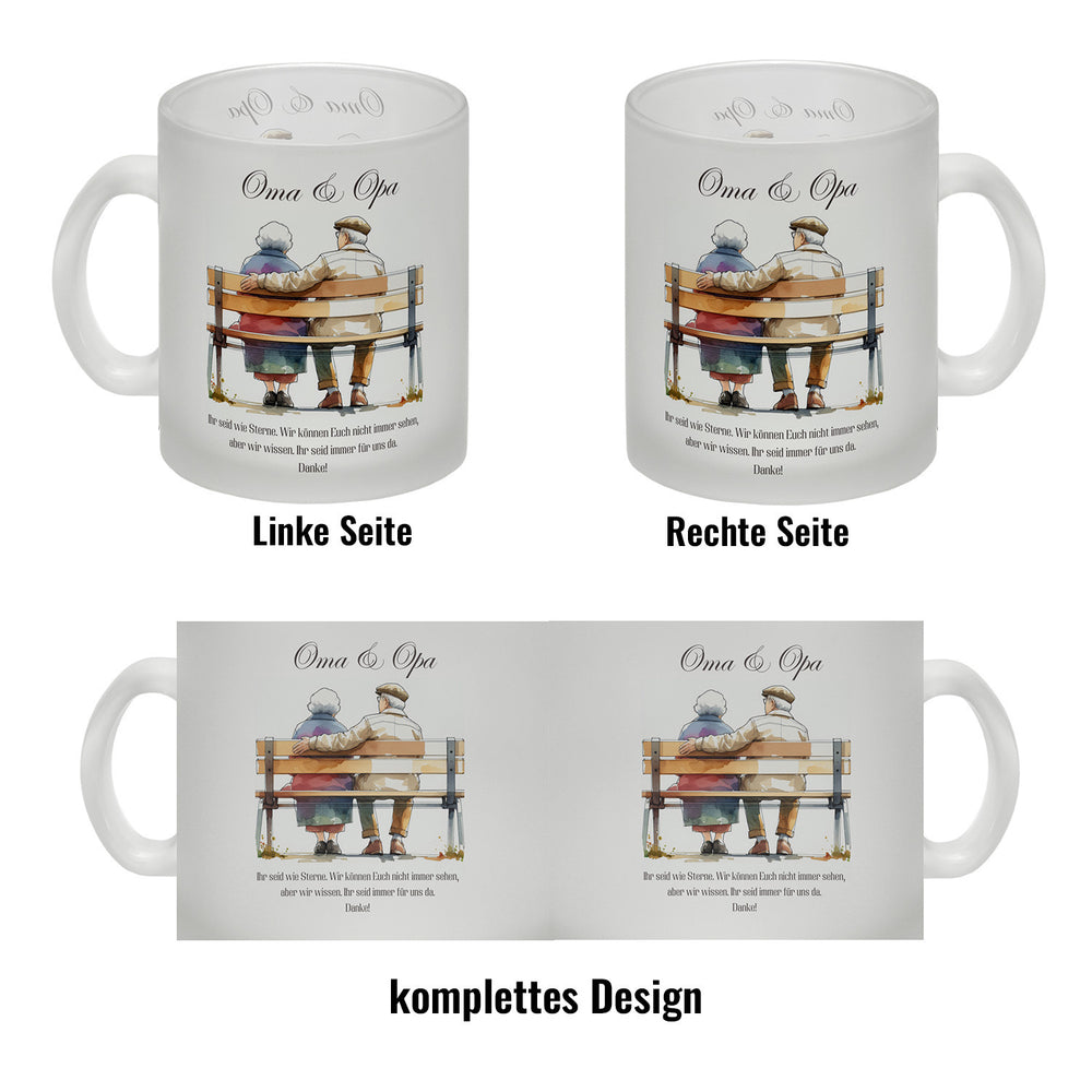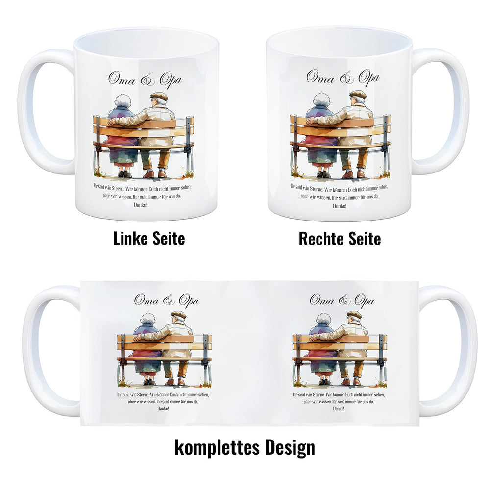 - 1x Oma und Opa auf Bank Kaffeebecher in der gewählten Ausführung