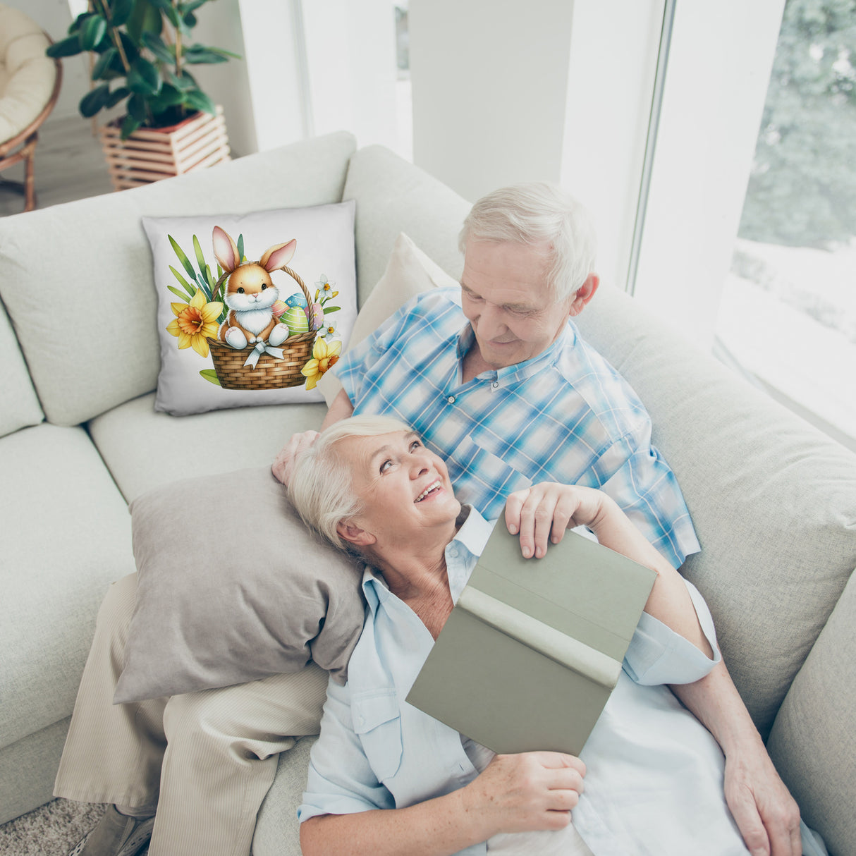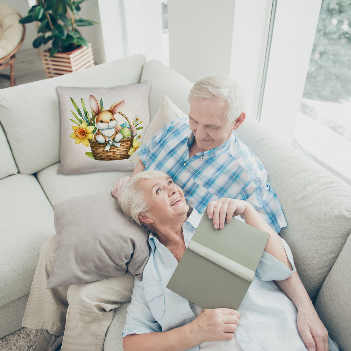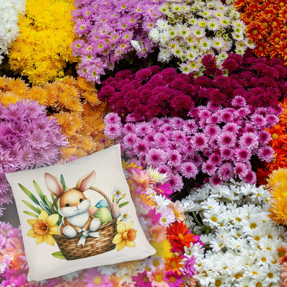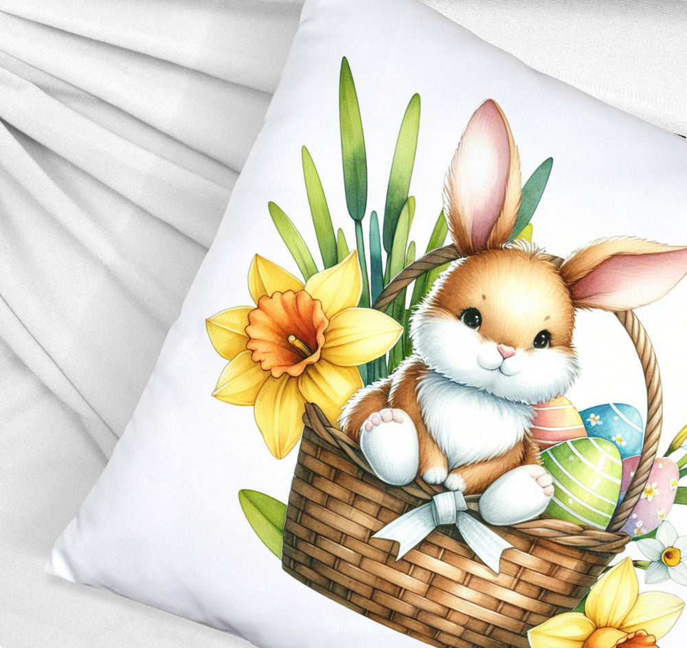 - Hoppla, hier kommt Komfort mit einem Twist! Unser "Osterhase im Osterkorb Kissen" bringt den Frühling direkt auf dein Sofa. Stell dir vor: Ein flauschiger Hase kuschelt sich in einen Korb, umgeben von farbenfrohen Osterglocken. Deine Couch war noch nie so einladend und festlich!
