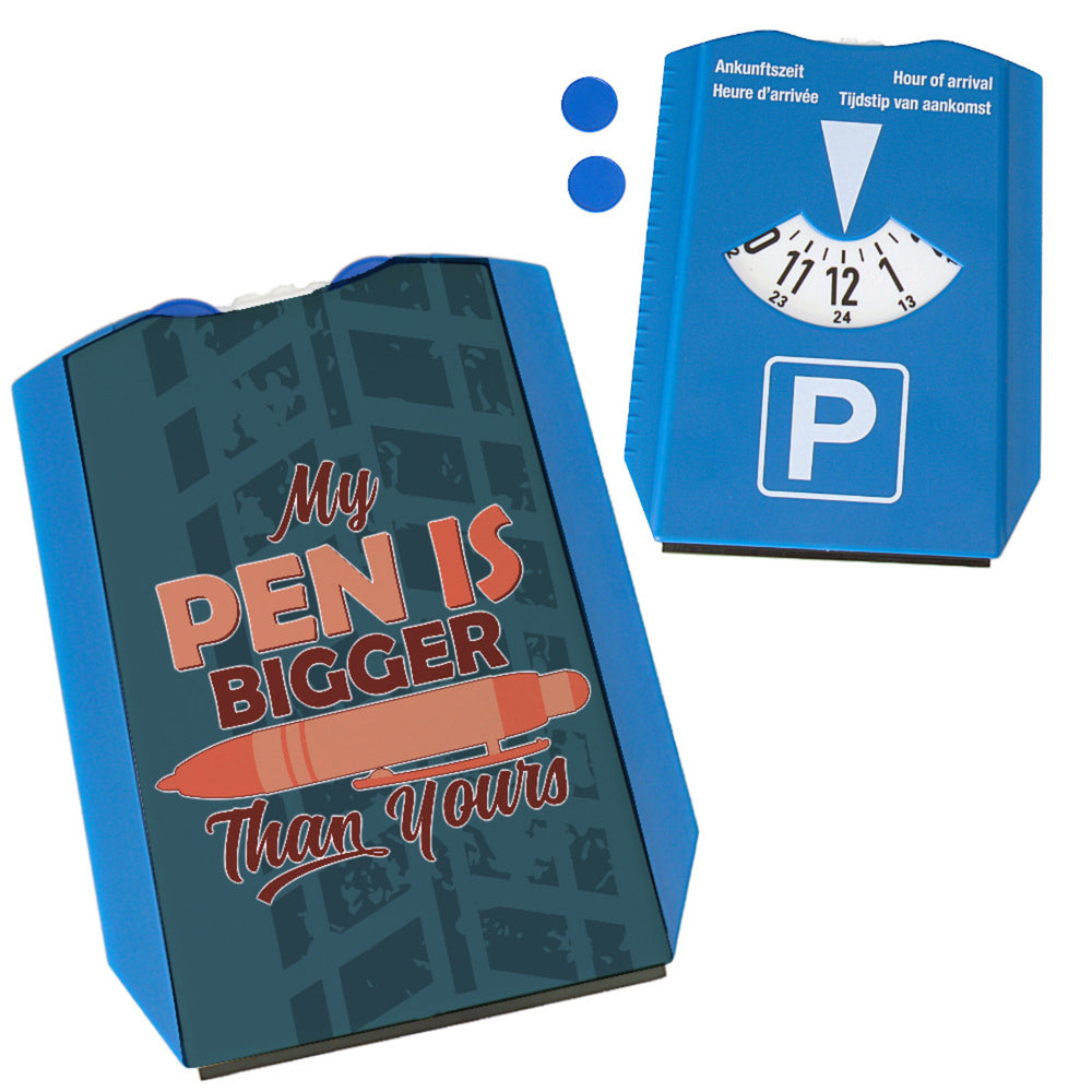 - Hol dir noch heute die "Pen-is" Parkscheibe mit Spruch und verschenke ein witziges Geschenk. Die Parkscheibe trägt den Spruch "My Pen is bigger than yours". Dieses lustige Wortspiel wird jedem zum Lachen bringen.