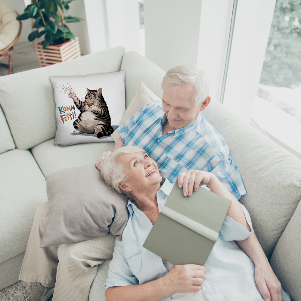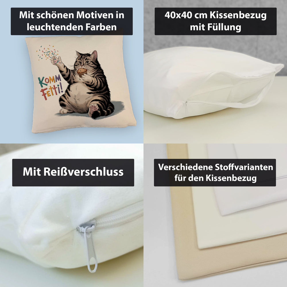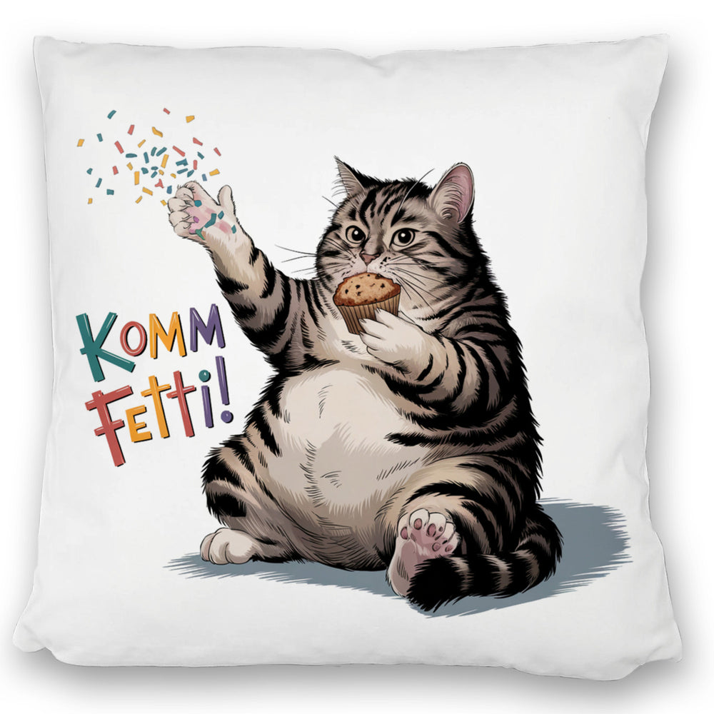 - Dieses bezaubernde Kissen zeigt eine pummelige Katze mit einem Cupcake, die fröhlich Konfetti in die Luft wirft. Mit ihrem gestreiften Grau-Weiß-Fell sitzt sie gemütlich vor einem schlichten weißen Hintergrund. Ein bunter Schriftzug "Komm Fetti!" am unteren Rand verleiht dem Kissen zusätzlichen Charme und Fröhlichkeit.