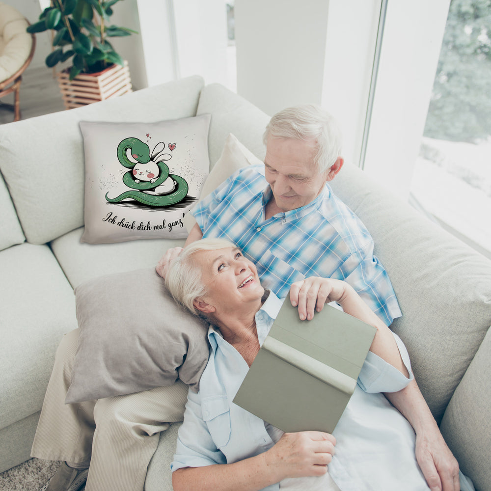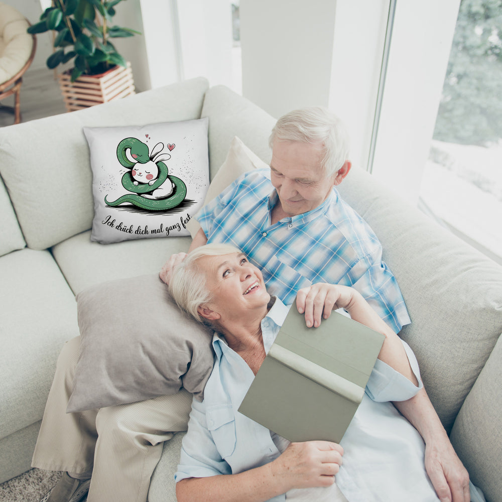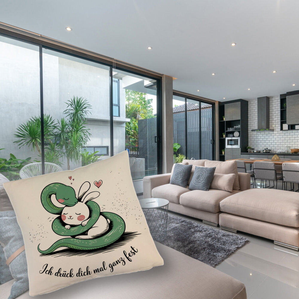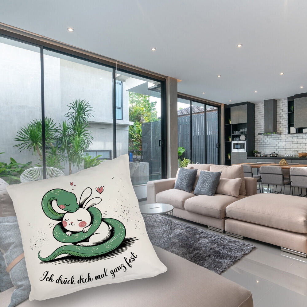 - Und das Beste? Dieses Kissen trägt den Spruch: "Ich drück dich mal ganz fest." Ein klares Statement für Liebe und Freundschaft! Perfekt, um dir oder jemandem, den du schätzt, eine Freude zu machen. Hol dir das Kissen mit Schlange und Kaninchen-Motiv und lass die Kuschelzeit beginnen!