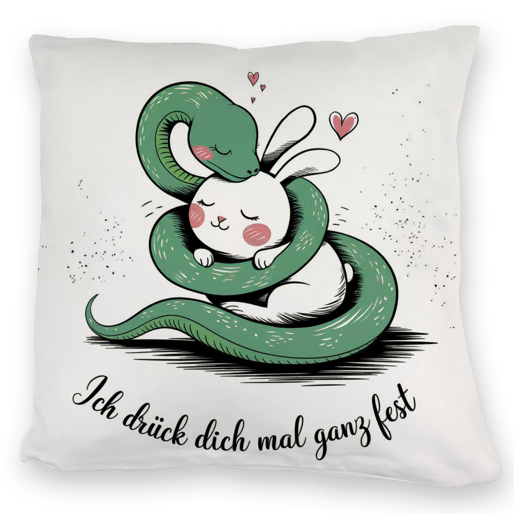 - Wolltest du schon immer ein Kissen, das dich liebevoll umarmt? Voilà! Dieses charmante Kissen zeigt eine grüne Schlange, die ein weißes Kaninchen fest im Griff hat – natürlich alles ganz herzlich gemeint. Mit rosigen Wangen und einem Herzsymbol wird die Zuneigung perfekt in Szene gesetzt.