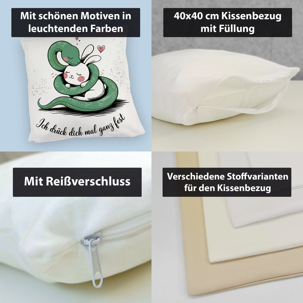 Und das Beste? Dieses Kissen trägt den Spruch: "Ich drück dich mal ganz fest." Ein klares Statement für Liebe und Freundschaft! Perfekt, um dir oder jemandem, den du schätzt, eine Freude zu machen. Hol dir das Kissen mit Schlange und Kaninchen-Mot Hinweise: Material: Polyester / Größe: ca. 40x40 cm / Bezug bei 30° waschbar
