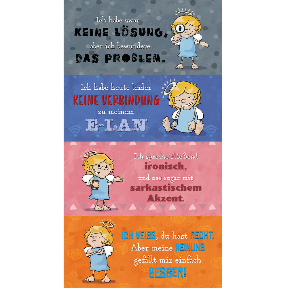 - Der Tischaufsteller verfügt über zwölf freche, ironische sowie sarkastische Sprüche.