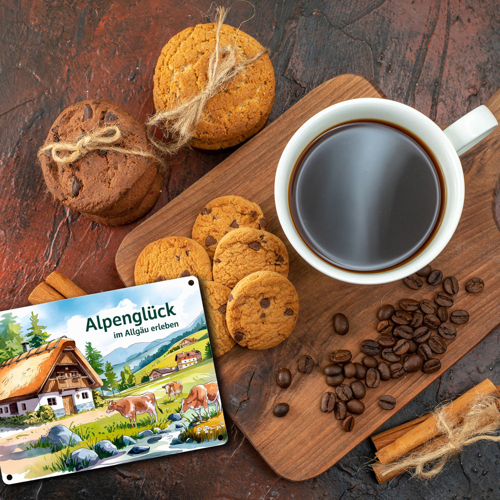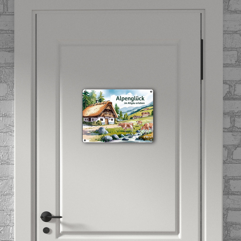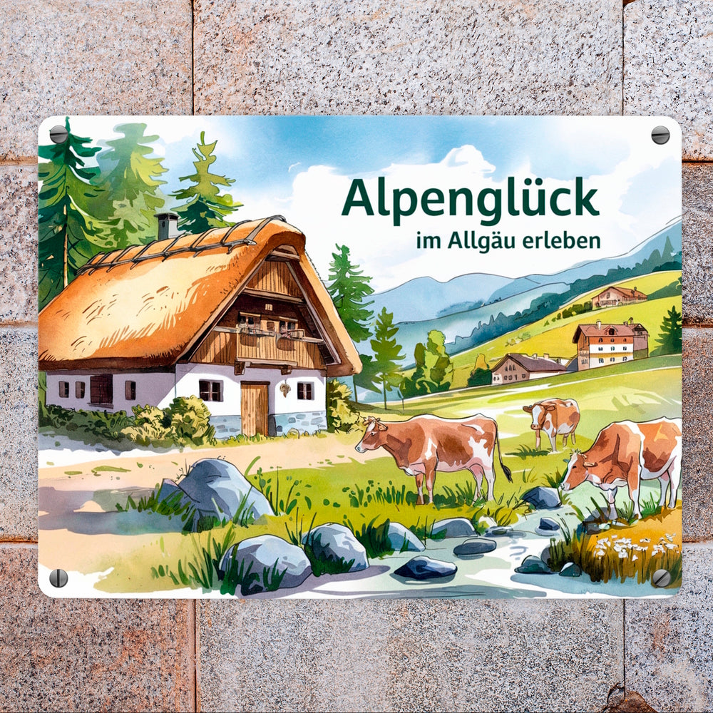 • Das "Alpenglück in den Bergen" Metallschild zeigt ein malerisches Aquarell der Allgäu-Landschaft. Mit einem traditionellen Bauernhaus, sanften Hügeln, Kiefernwäldern und friedlich grasenden Kühen, hebt es die idyllische Natur hervor. Ein klarer Bach und ein humorvoller Spruch runden das rustikale Design ab.