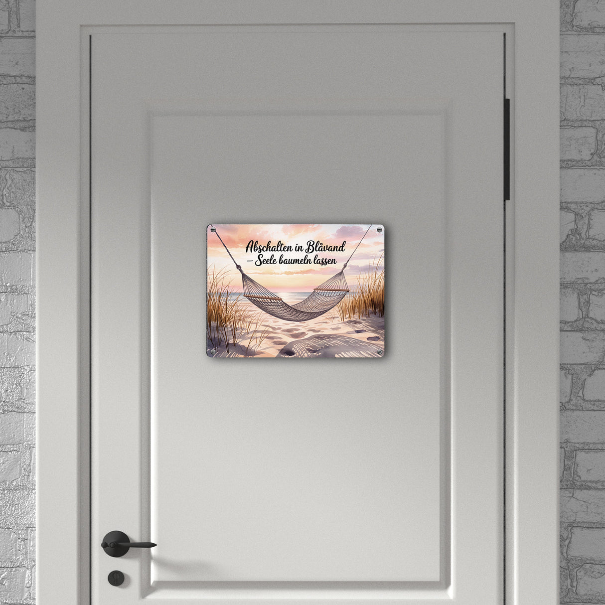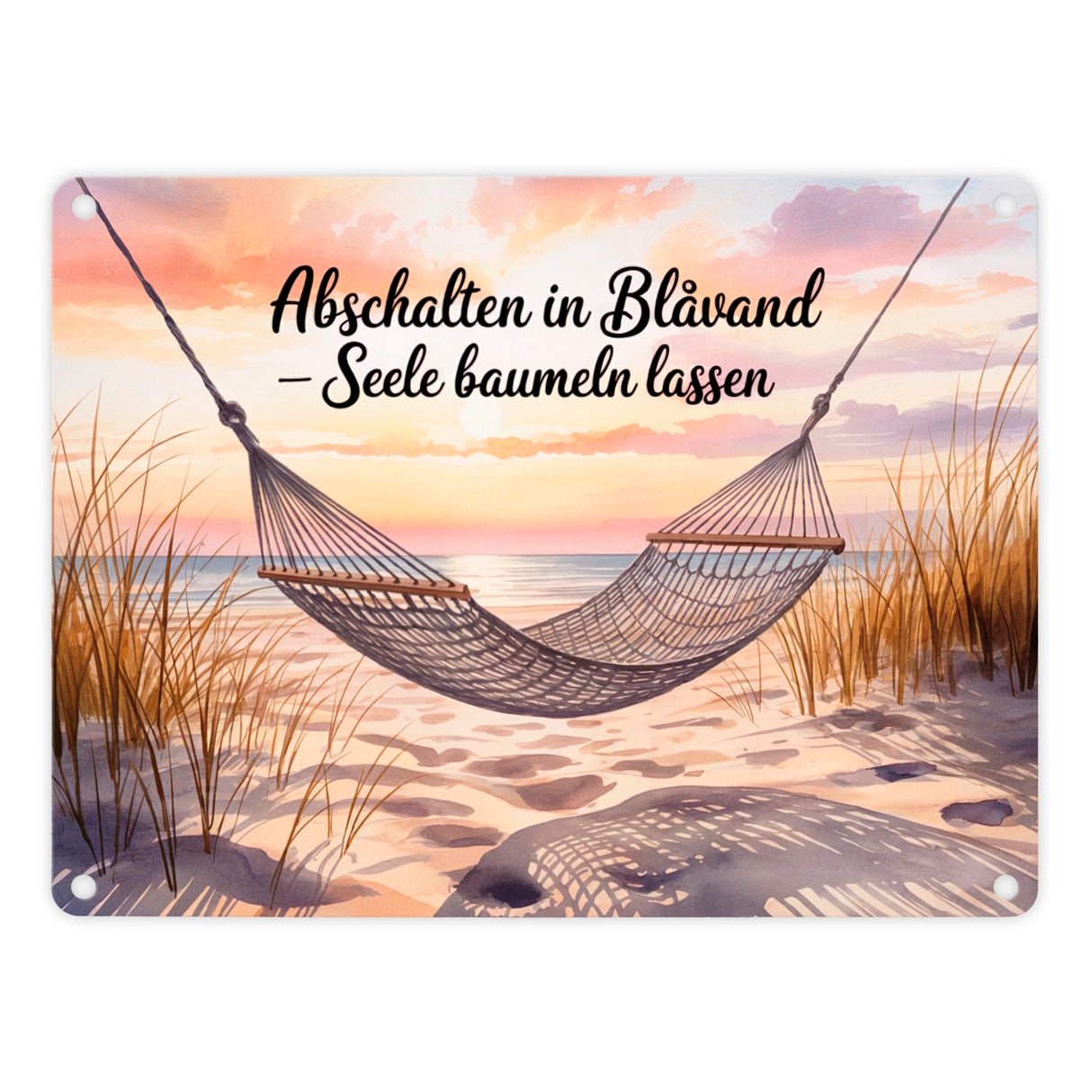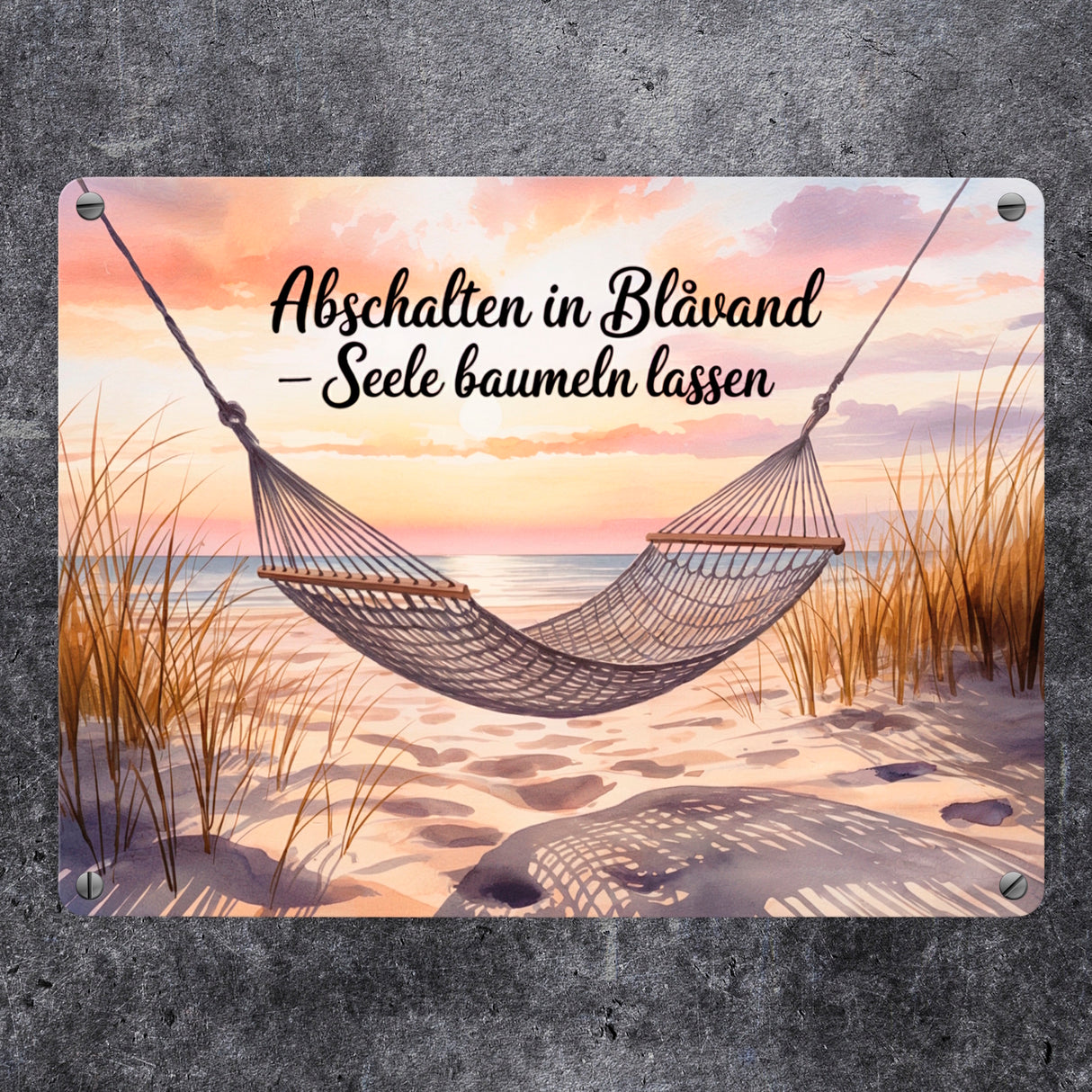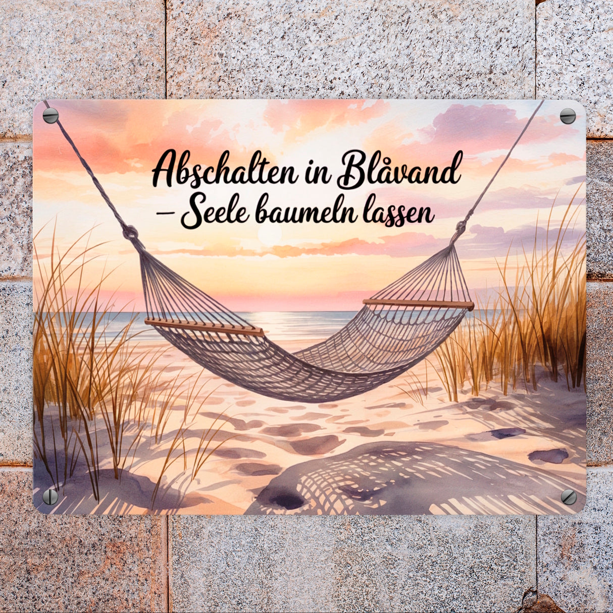• Dieses charmante Metallschild präsentiert eine zauberhafte Aquarell-Illustration: Eine Hängematte schaukelt sanft zwischen goldenen Sanddünen bei Sonnenuntergang. Die warmen Farben von Orange, Rosa und Violett malen einen friedlichen Himmel, während weiche Schatten im feuchten Sand eine Atmosphäre der Ruhe schaffen. Der Spruch "Abschalten in Blåvand – Seele baumeln lassen" rundet das Bild ab.