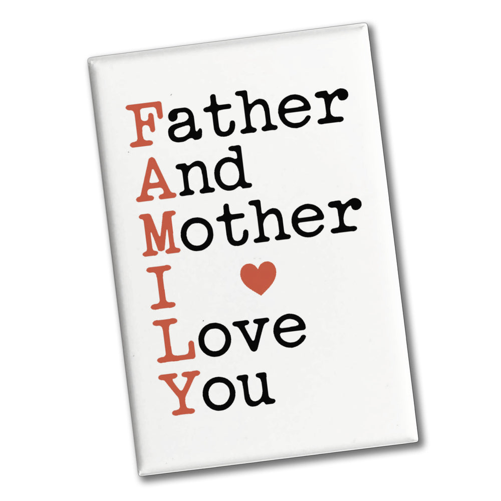 • Der FAMILY Herz Souvenir Magnet besticht durch sein einzigartiges, nostalgisches Schreibmaschinenstil-Design. Die Worte "Father And Mother I Love You" sind klar zentriert und ergeben mit ihren Anfangsbuchstaben das Wort "Family". Ein kleines, rotes Herz vervollständigt das liebevolle Motiv. Perfekt für Kühlschrankliebhaber und Dekofreunde!
