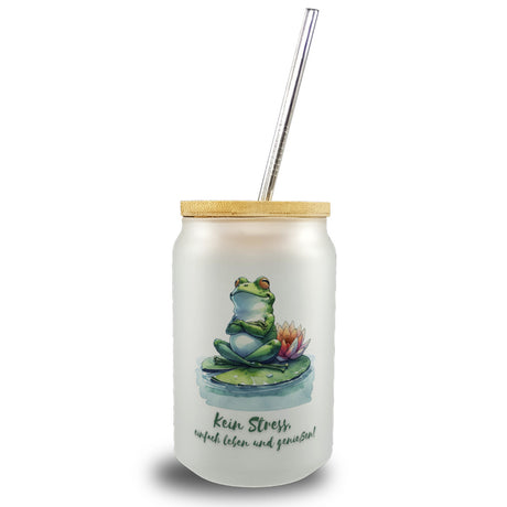 Frosch auf Seerose Trinkglas mit Bambusdeckel mit Spruch Kein Stress einfach leben und genießen