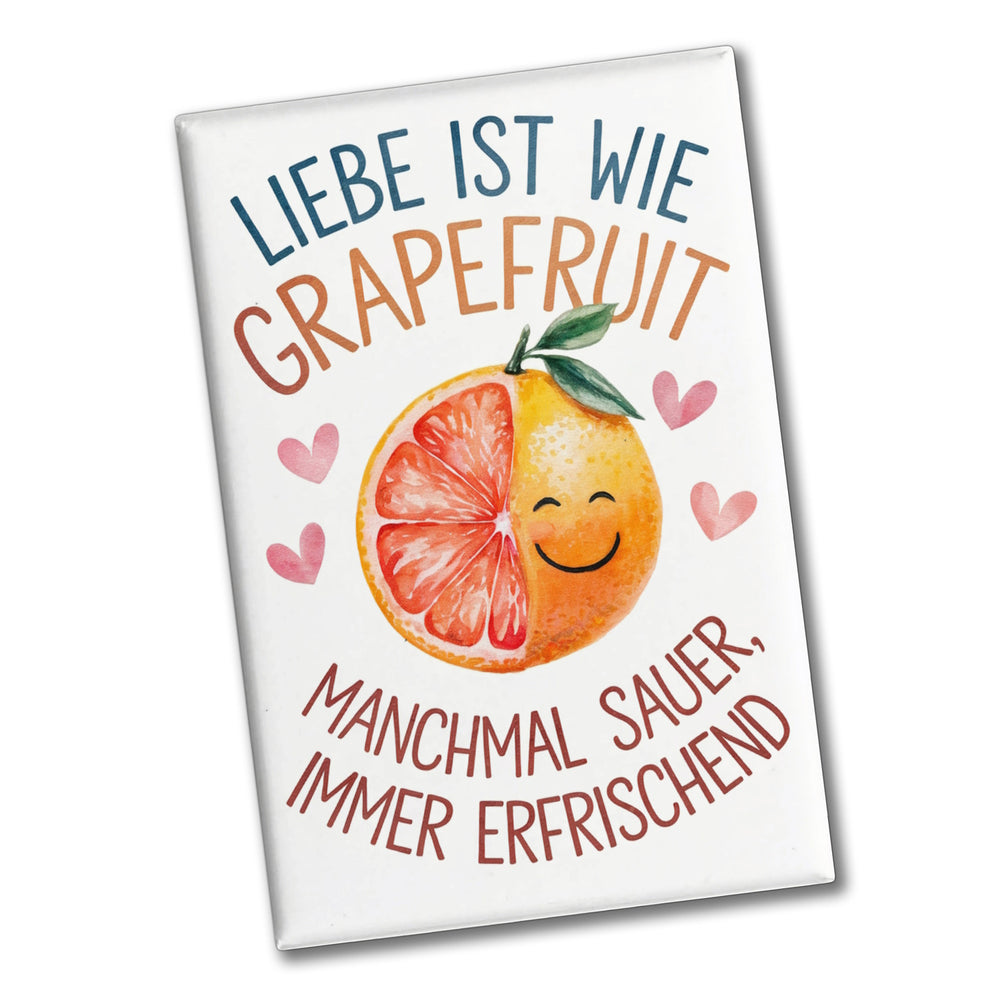 - Dieser eckige Magnet zeigt eine farbenfrohe Grapefruit in zwei Hälften auf weißem Hintergrund. Die obere Hälfte ist orange mit einem fröhlichen Gesicht, die untere pink-rot mit dem Fruchtfleisch. Herzsymbole umrahmen das Motiv und der Vers "Liebe ist wie Grapefruit: manchmal sauer, immer erfrischend" steht in verspielter Schrift darüber.