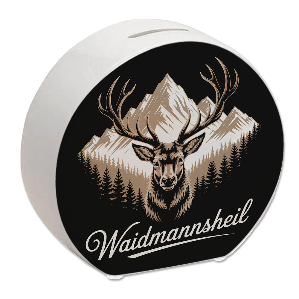 - 1x Hirsch vor Bergkulisse Waidmannsheil Spardose für Jäger in der gewählten Ausführung