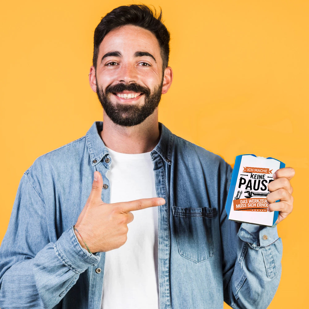 • Unser vielseitiger Parkscheiben-Profi im weißen Design punktet mit einem frechen Spruch: "ICH MACHE KEINE PAUSE, DAS WERKZEUG MUSS SICH ERHOLEN." Dazu glänzt eine Illustration eines Schraubenschlüssels. Die Kombination aus Schwarz, Orange und Weiß macht sie zum ultimativen Hingucker und perfekten Gadget für alle Schrauber-Fans.
