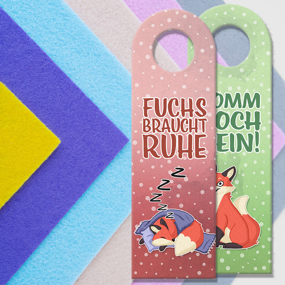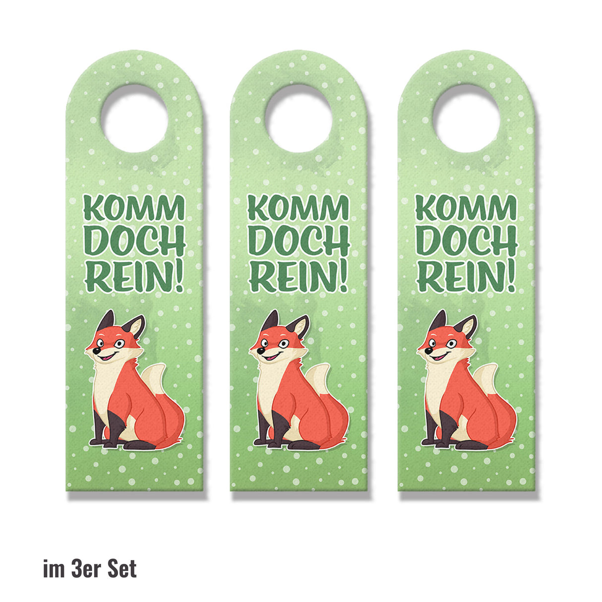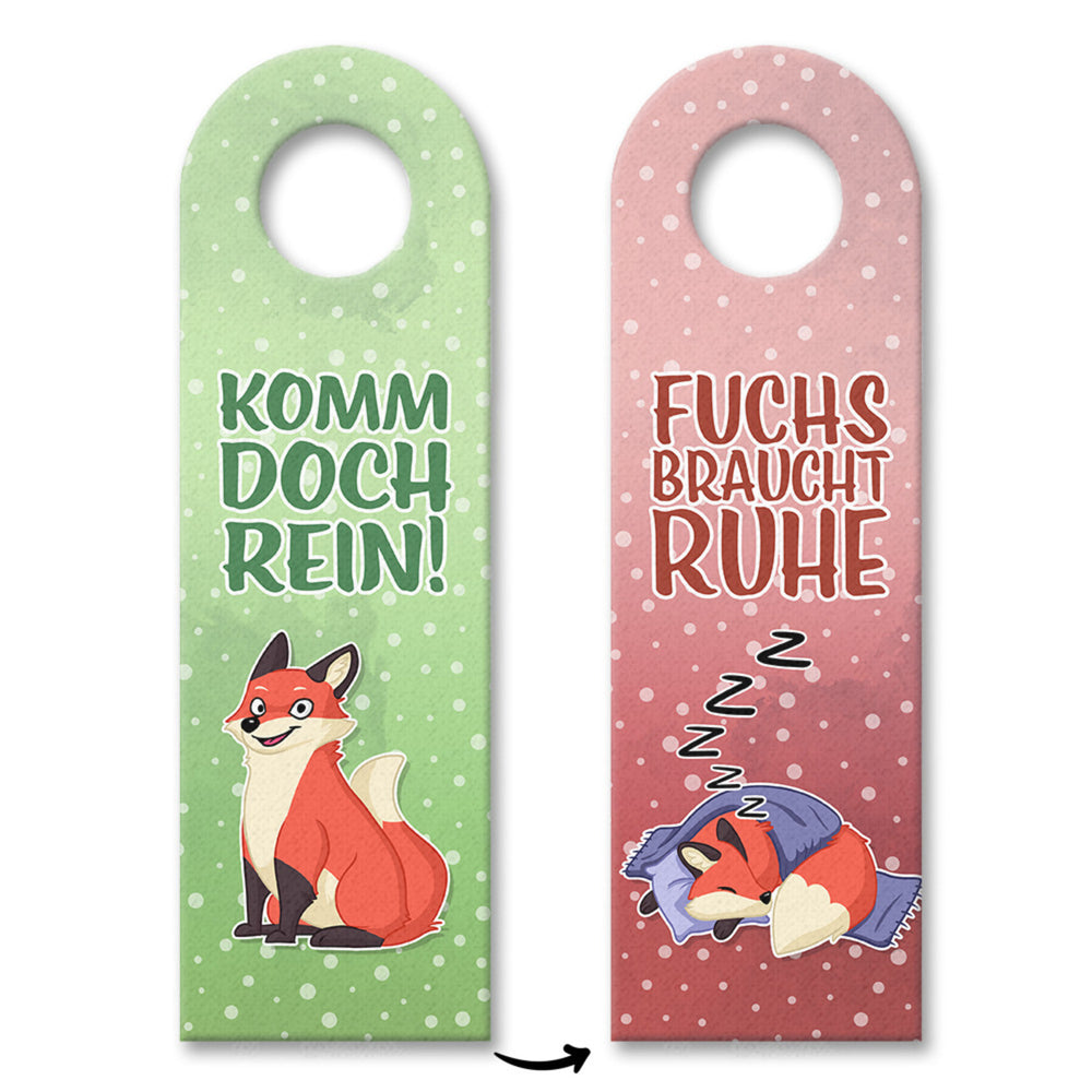 - Der Türhänger hat auf beiden Seiten einen anderen Fuchs. Einer ist hellwach, der andere schläft! Die Seiten lesen dementsprechend 'Komm doch rein' und 'Fuchs braucht Ruhe'. Zusätzlich zeigen die beiden Seiten die entsprechenden Signalfarben grün und rot.