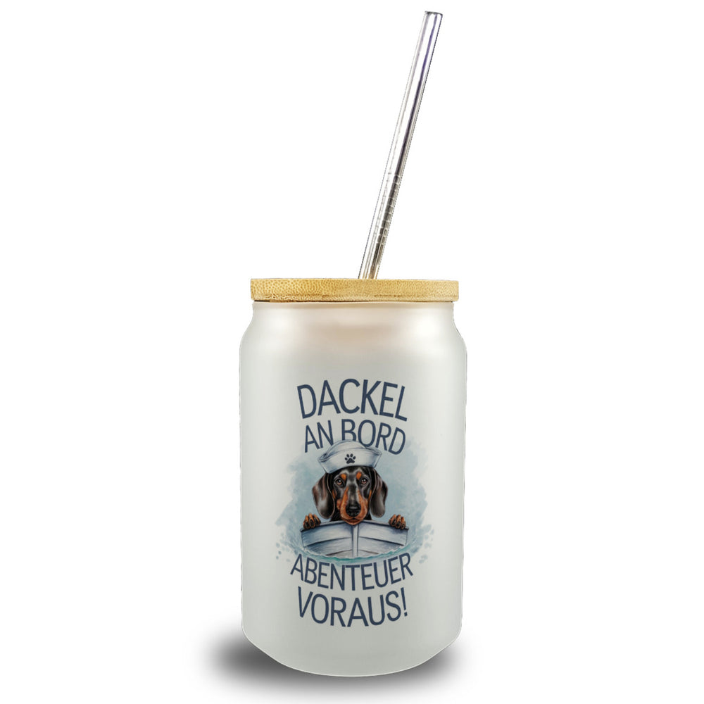 Matrosen Dackel im Boot Trinkglas mit Bambusdeckel - Abenteuer voraus - Bambusdeckel ist auf Lager und wird versandt, sobald es wieder verfügbar ist