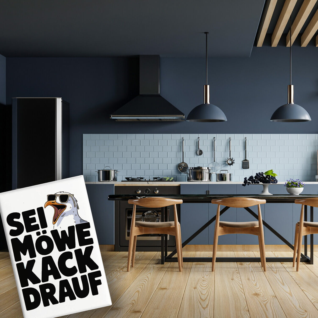 - Dieser eckige Magnet zeigt eine stylische Möwe mit Sonnenbrille, die lässig auf einem weißen Hintergrund thront. Der freche Spruch "SEI MÖWE kack drauf" verleiht dem Design eine humorvolle Note. Perfekt als witziges Deko-Element, das überall für gute Laune sorgt!
