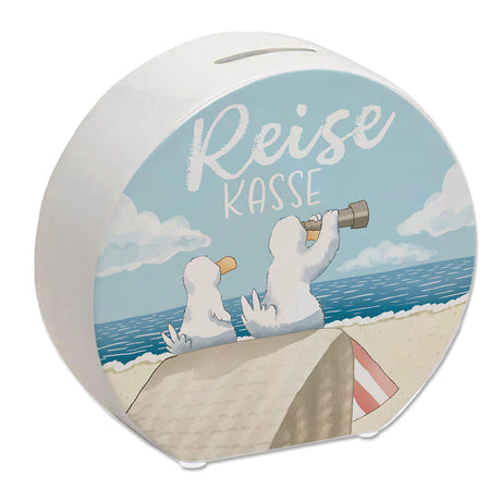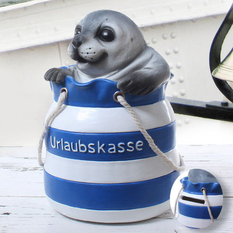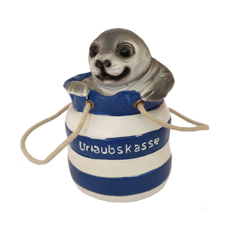 Robbe in Strandtasche Spardose