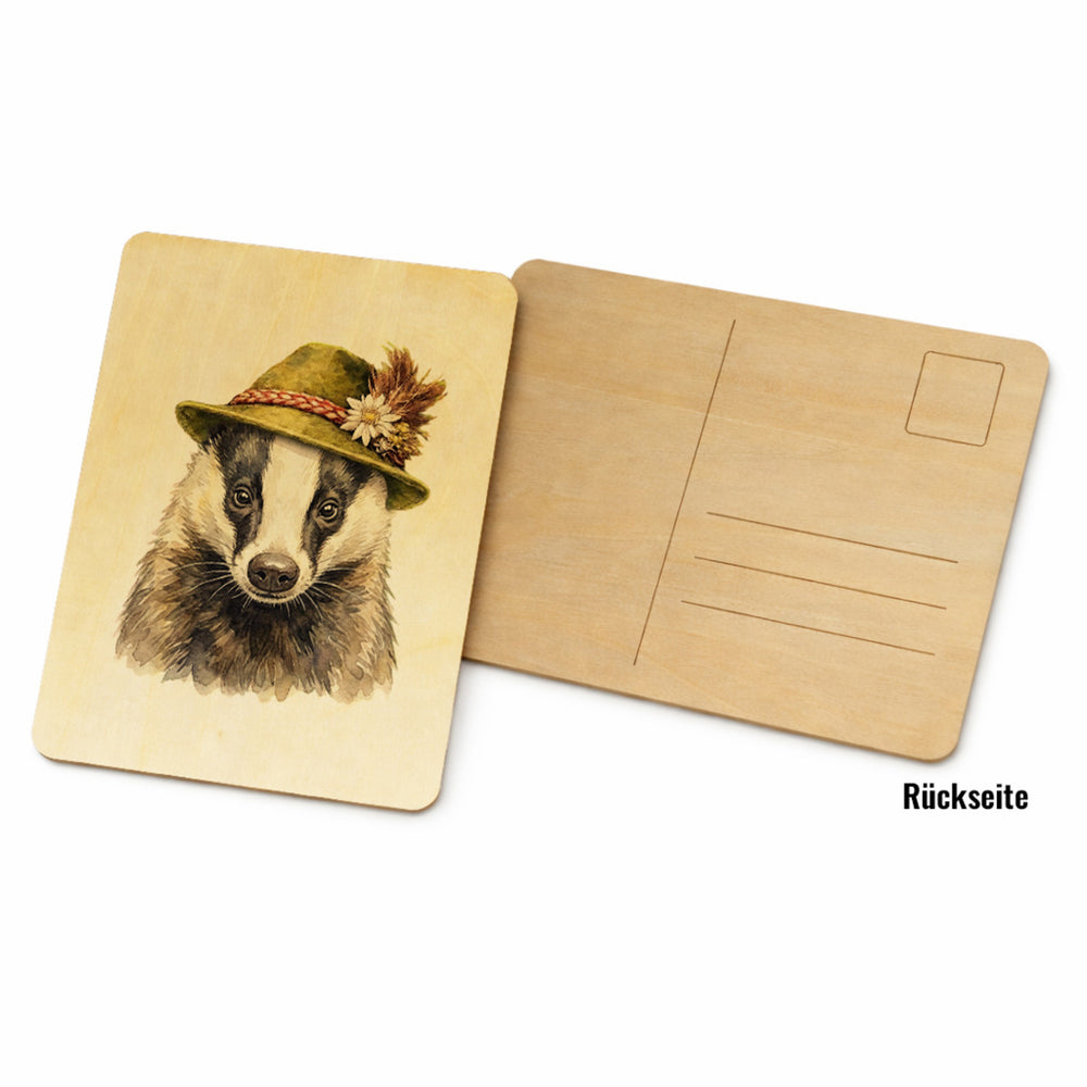 Dachs mit alpenländischem Trachtenhut Postkarte aus Holz