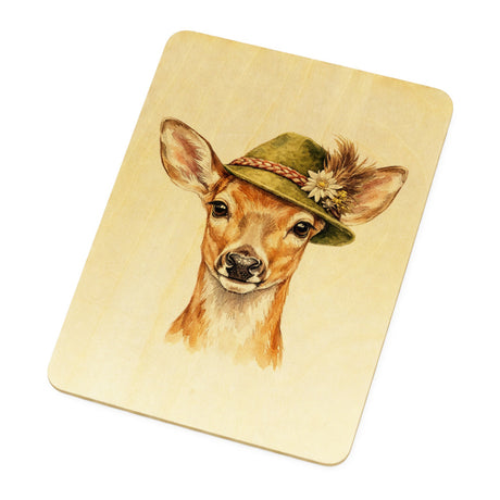Reh mit alpenländischem Trachtenhut Postkarte aus Holz