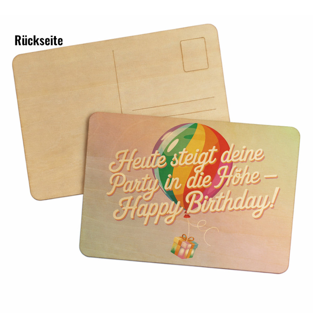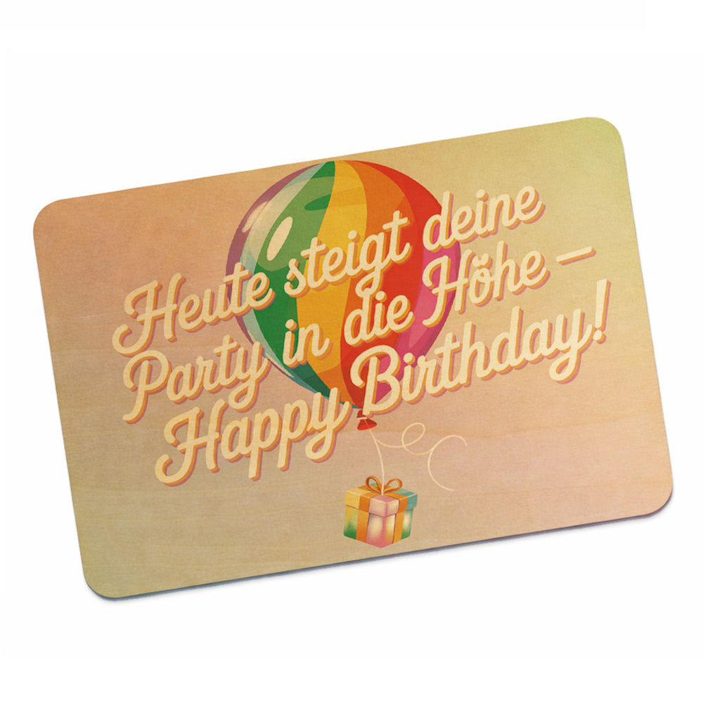 - Lieferumfang: 1x Regenbogenballon Postkarte aus Holz Heute steigt deine Party
