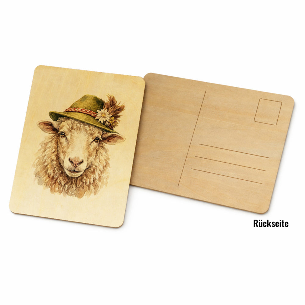 Schaf mit alpenländischem Trachtenhut Postkarte aus Holz