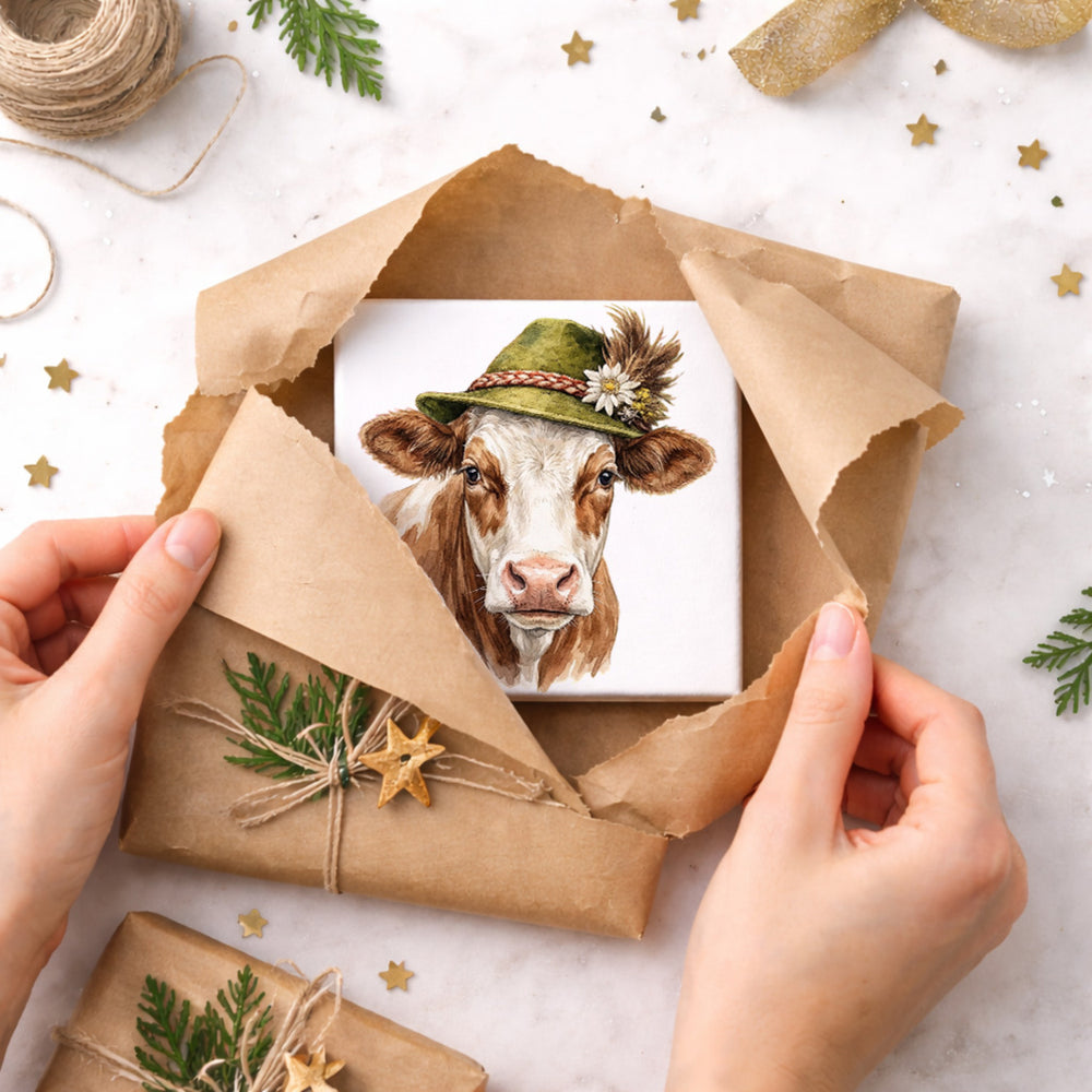 Trachtenhut Alm-Tiere Kuh Holzbild in 10x10 cm zum Stellen oder Aufhängen