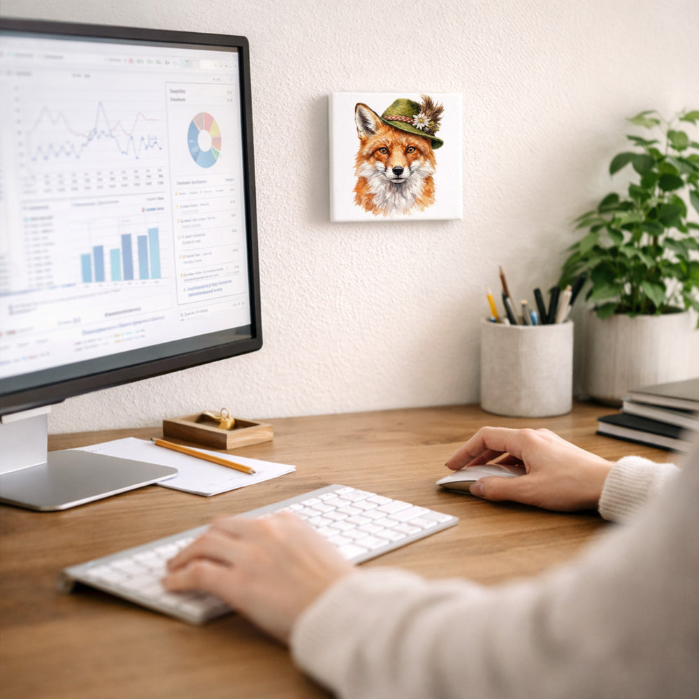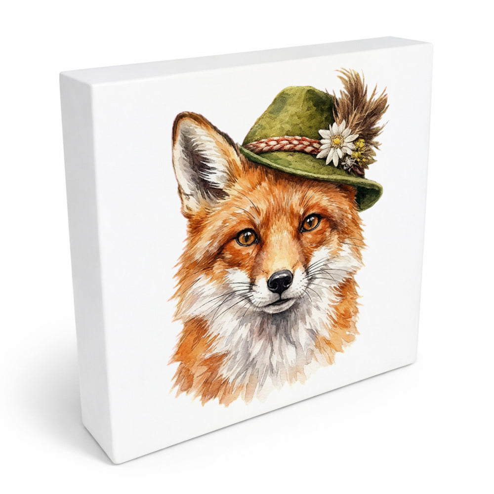 - Dieses wunderschöne Holzbild zeigt einen detailverliebten Fuchskopf im Aquarellstil, der einen traditionellen grünen Tiroler Trachtenhut trägt. Mit Feder und Edelweiß verziert, bringt dieses Kunstwerk rustikale Alpenatmosphäre in jedes Zuhause. Ob zum Hinstellen oder Aufhängen, es ist ein echter Hingucker für Naturliebhaber!