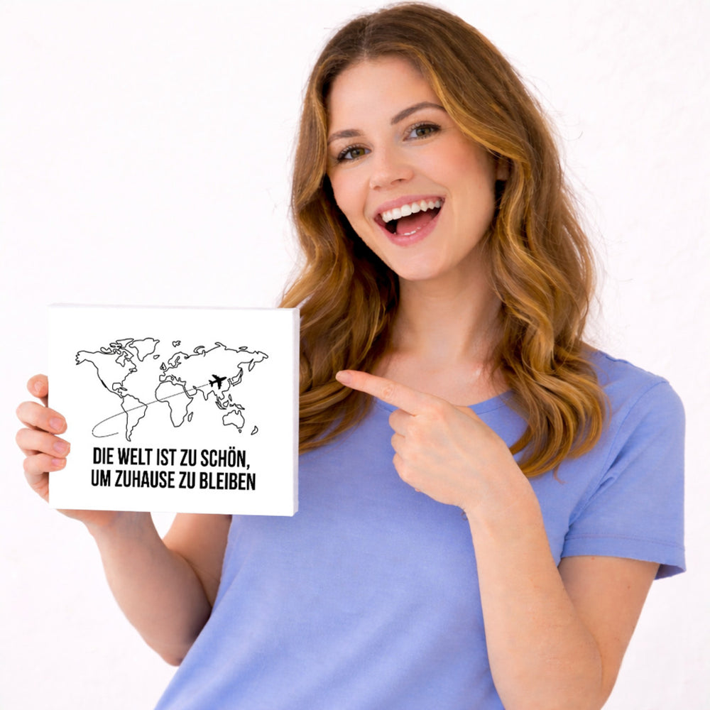 - Stell dir vor, du betrachtest eine schicke weiße Wand, auf der eine minimalistische Weltkarte abgebildet ist, mit Flugrouten und einem kleinen Flugzeug, das in die Ferne düst. Darunter steht fett: "Die Welt ist zu schön, um zuhause zu bleiben." Dieses Holzbild bringt Reisefieber pur in dein Wohnzimmer!