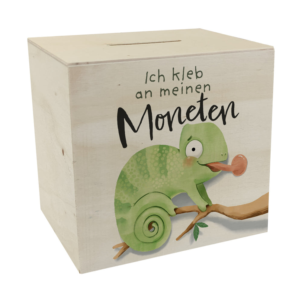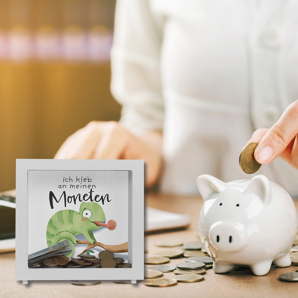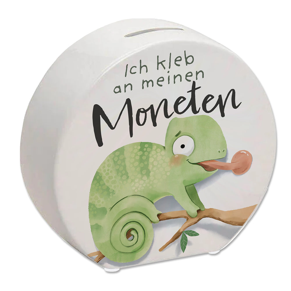Chamäleon Spardose mit Spruch Ich kleb an meinen Moneten