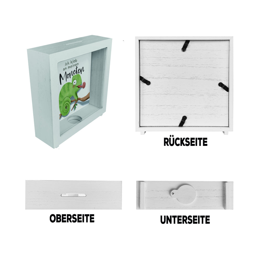 - 1x Chamäleon Spardose mit Spruch Ich kleb an meinen Moneten in der gewählten Ausführung