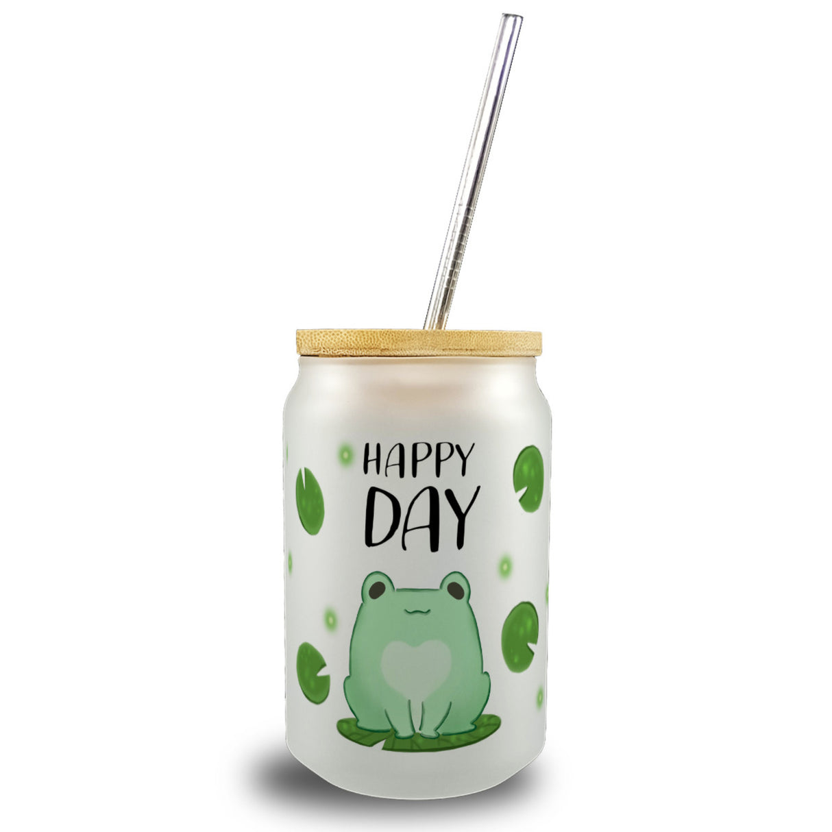 Frosch Trinkglas mit Bambusdeckel mit Spruch Happy Day