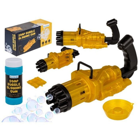 Maschinengewehr Seifenblasenpistole in gold mit Seifenlauge und Schale
