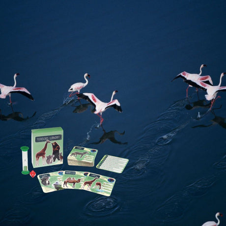 Tierisches Lernquiz Gesellschaftsspiel mit Sanduhr und Würfel