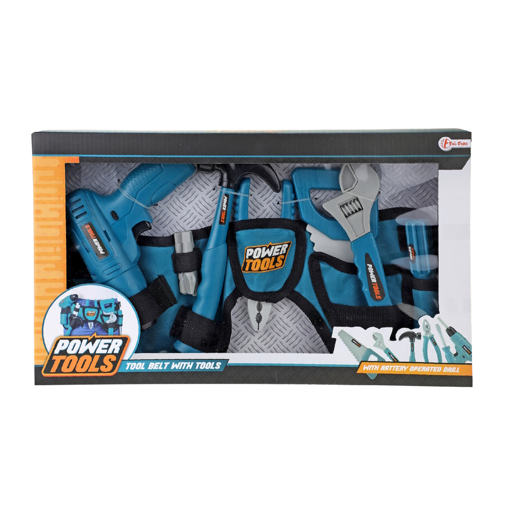 - 1x Spielzeug Werkzeuggürtel für Kinder Werkzeug Spiel im 6er-Set. Bestehend aus 1x Bohrmaschine, 1x Hammer, 1x Zange, 1x Säge, 1x Schraubenschlüssel, 1x Schraubendreher und 3x Aufsätze Bohrmaschine.