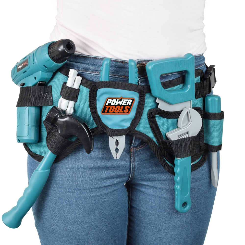 - Schnapp dir den stylischen Werkzeuggürtel mit kindersicherer Schnalle und belade ihn mit Power Tools: Hammer, Zange und ein echter multitool Schraubendreher. Jede Tasche klimpert mit Spaß!