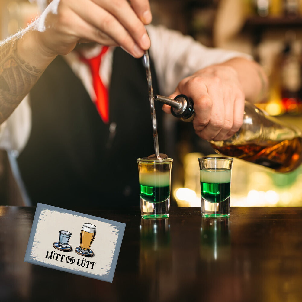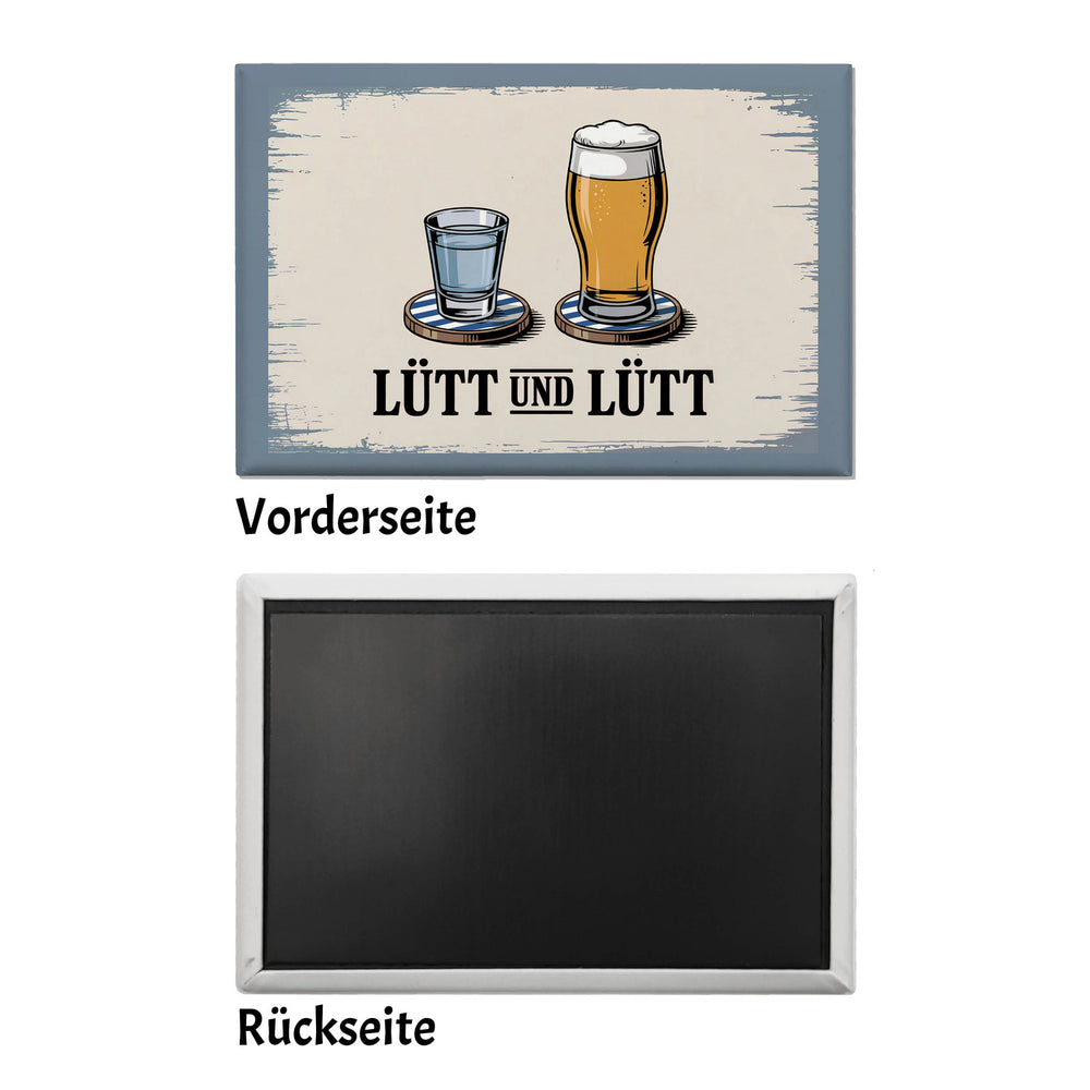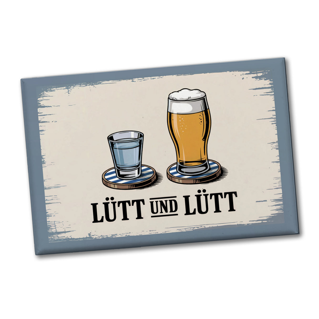 - Der Lütt und Lütt Souvenir Magnet ist ein echtes norddeutsches Schmuckstück! Er zeigt ein kleines Schnapsglas und ein schlankes Bierglas, beide auf stilvollen maritimen Untersetzern. Der verwitterte Holzuntergrund mit dem humorvollen Spruch "Lütt und Lütt" und nautischen Akzenten macht ihn zu einem charmanten Hingucker.