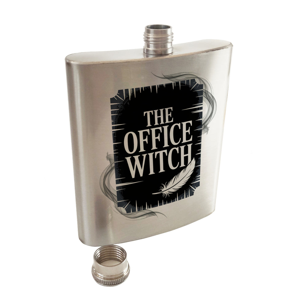 Der "The Office Witch Parodie Flachmann" zeigt ein einprägsames schwarz-weißes Design, das das Gefühl eines klassischen Horror-Buchcovers vermittelt. Mit gotischen, serifenbetonten Großbuchstaben steht der Spruch "THE OFFICE WITCH" im Mitt Hinweise: Material: Edelstahl / mit Schraubverschluss / Vorderseite bedruckt / Volumen ca. 200 ml / kompakte Größe